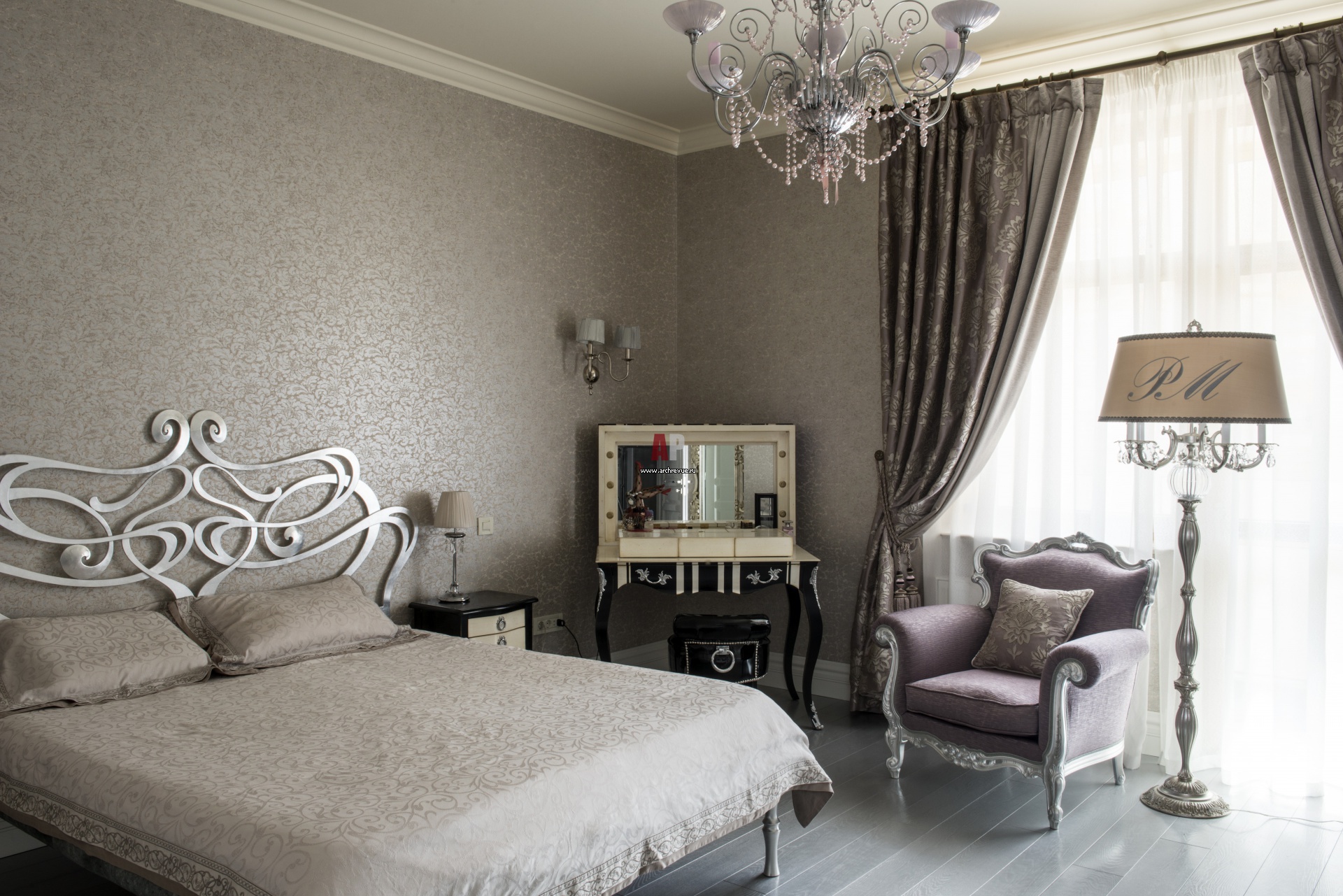 Стены спальни оформлены серо-серебристыми обоями с рисунком. Резное изголовье кровати выкрашено серебром. Кресло в духе необарокко обито тканью пыльного сиреневого цвета.