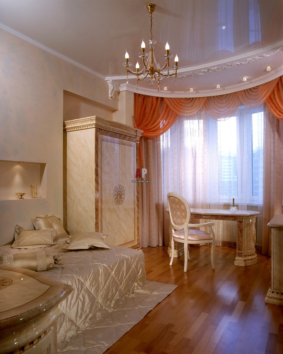 Интерьер детской спальни в классике. В полукруглом эркере – рабочий стол.