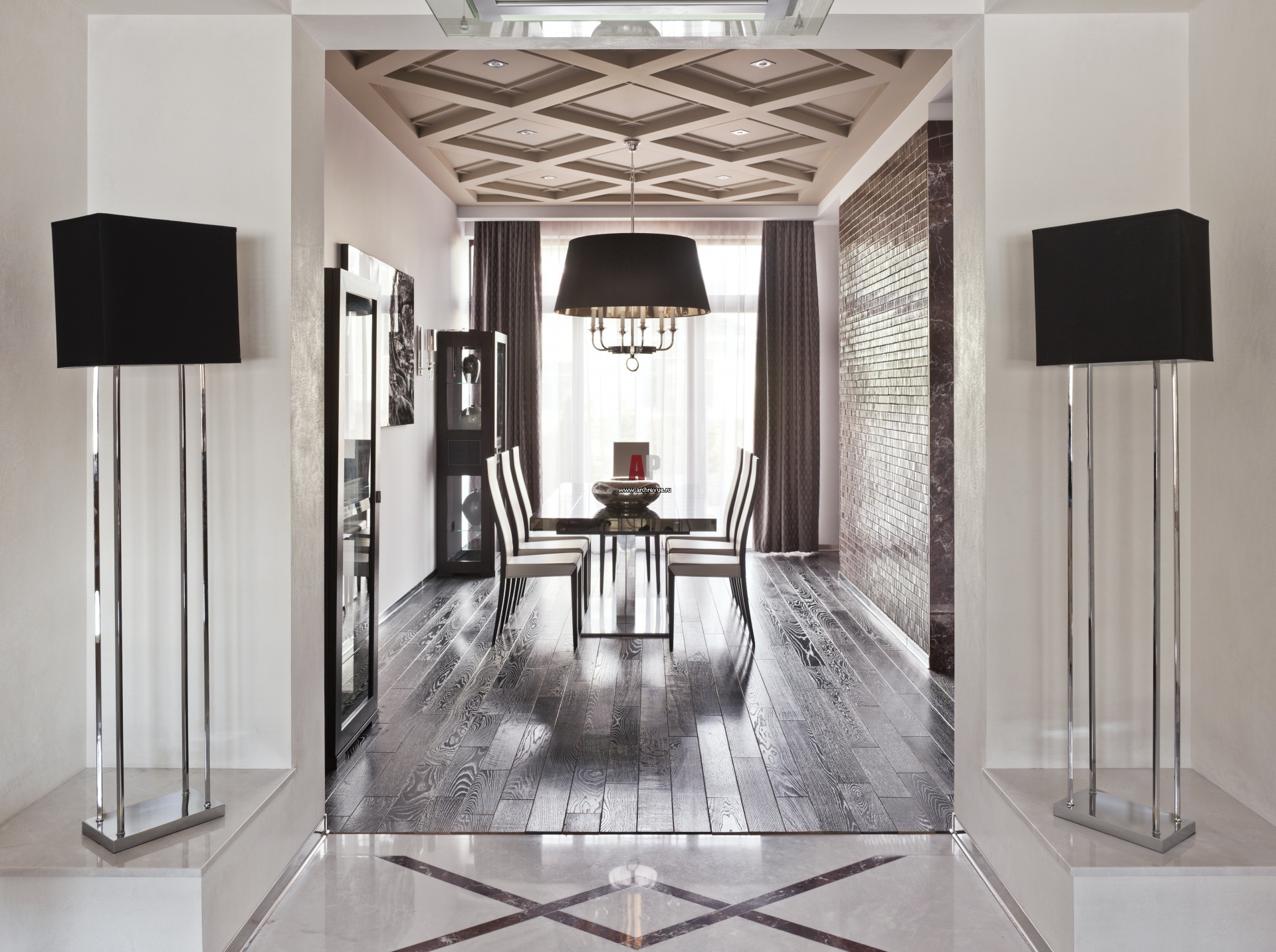Оформление парадной столовой в стиле ар-деко. Геометрическая раскладка на потолке выполнена с помощью гипсокартона и элементов из гипса. Обеденный стол, Bonaldo. Черные торшеры на металлическом основании в стиле ар-деко, Andrew Martin. Люстра над столом с черным абажуром, Estro.