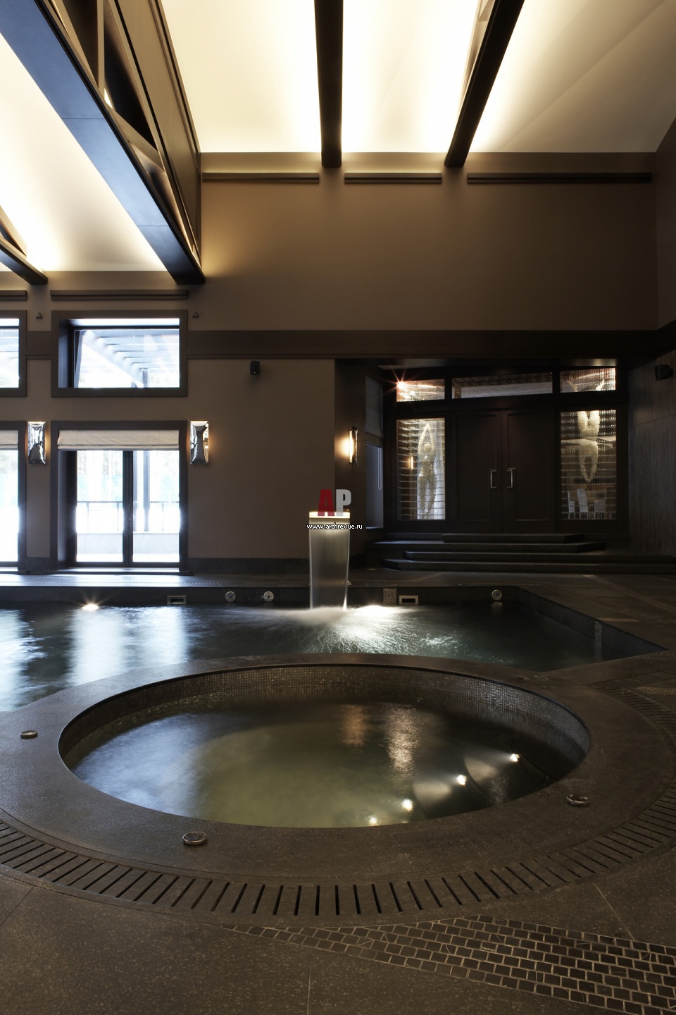 Вид со стороны купели с гидромассажем на двери, ведущие в столовую. Фигуры купальщиц за стеклом набраны из стеклянной мозаики, смонтированной на тонких металлических тросах. Оригинальные скульптуры выполнены французскими мастерами.