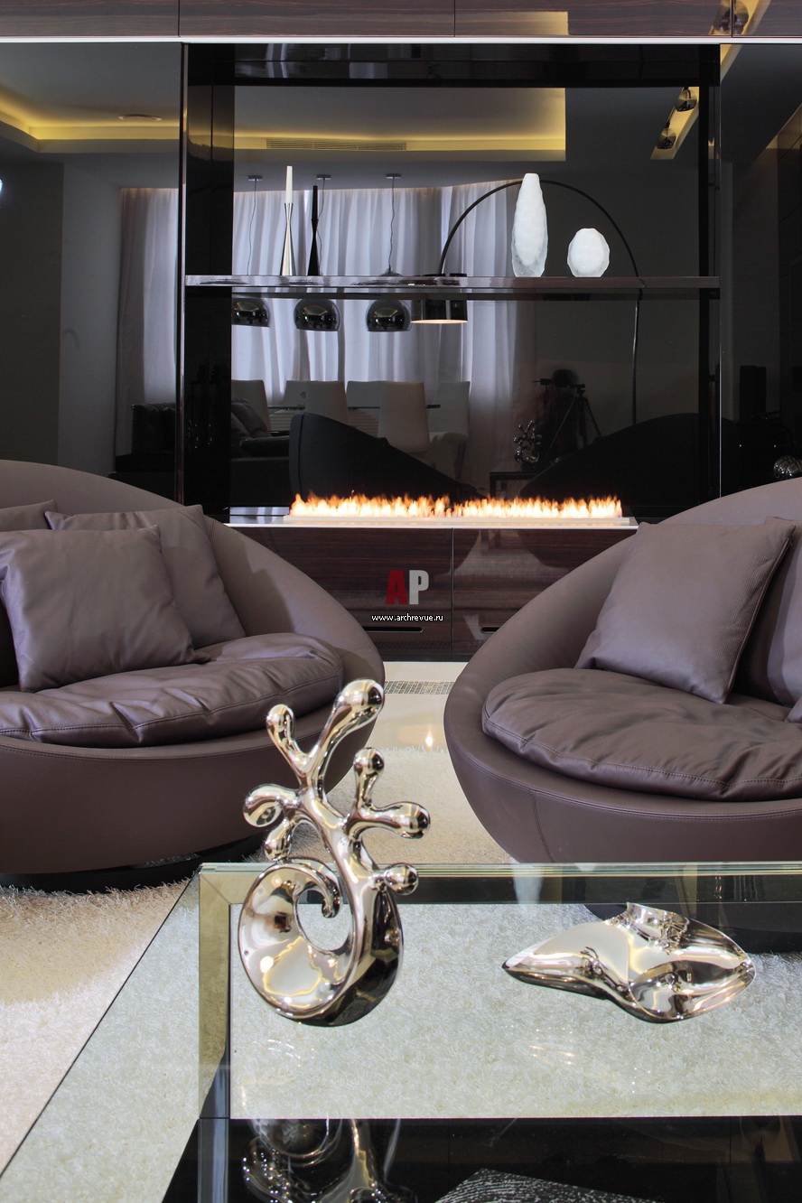 Камин Planika обрамлен панелями из шпона макасара, вместе со стеллажом он представляет цельную композицию.