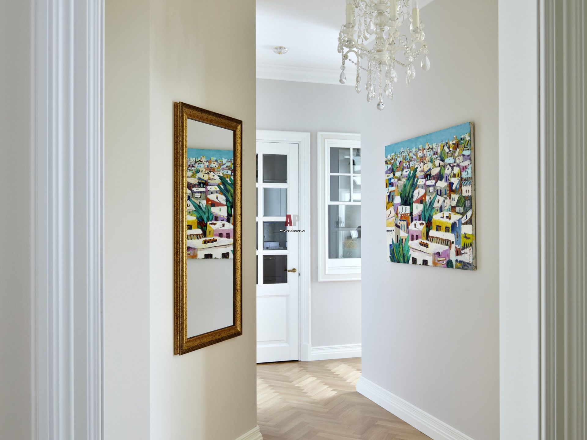 На фото – дизайн коридора в квартире, спроектированной на месте бывшей коммуналки. Стены выкрашены однотонной краской с бархатистой поверхностью. Раскладка паркета традиционной для столичных интерьеров елочкой.