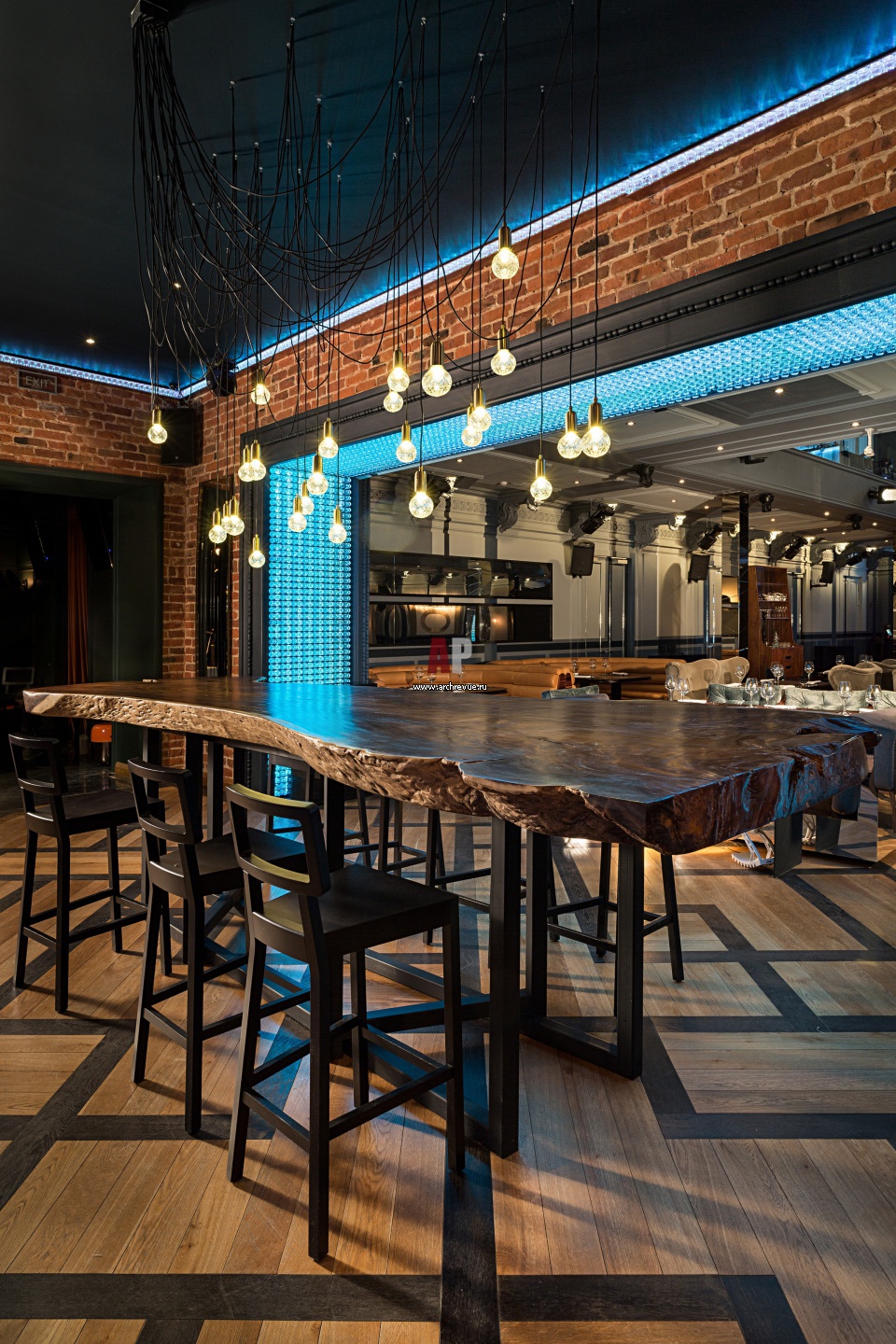 Центром одного из тех баров является стол-коряга, его столешница выполнена из продольного спила древнего дерева, привезенного с острова Ява.