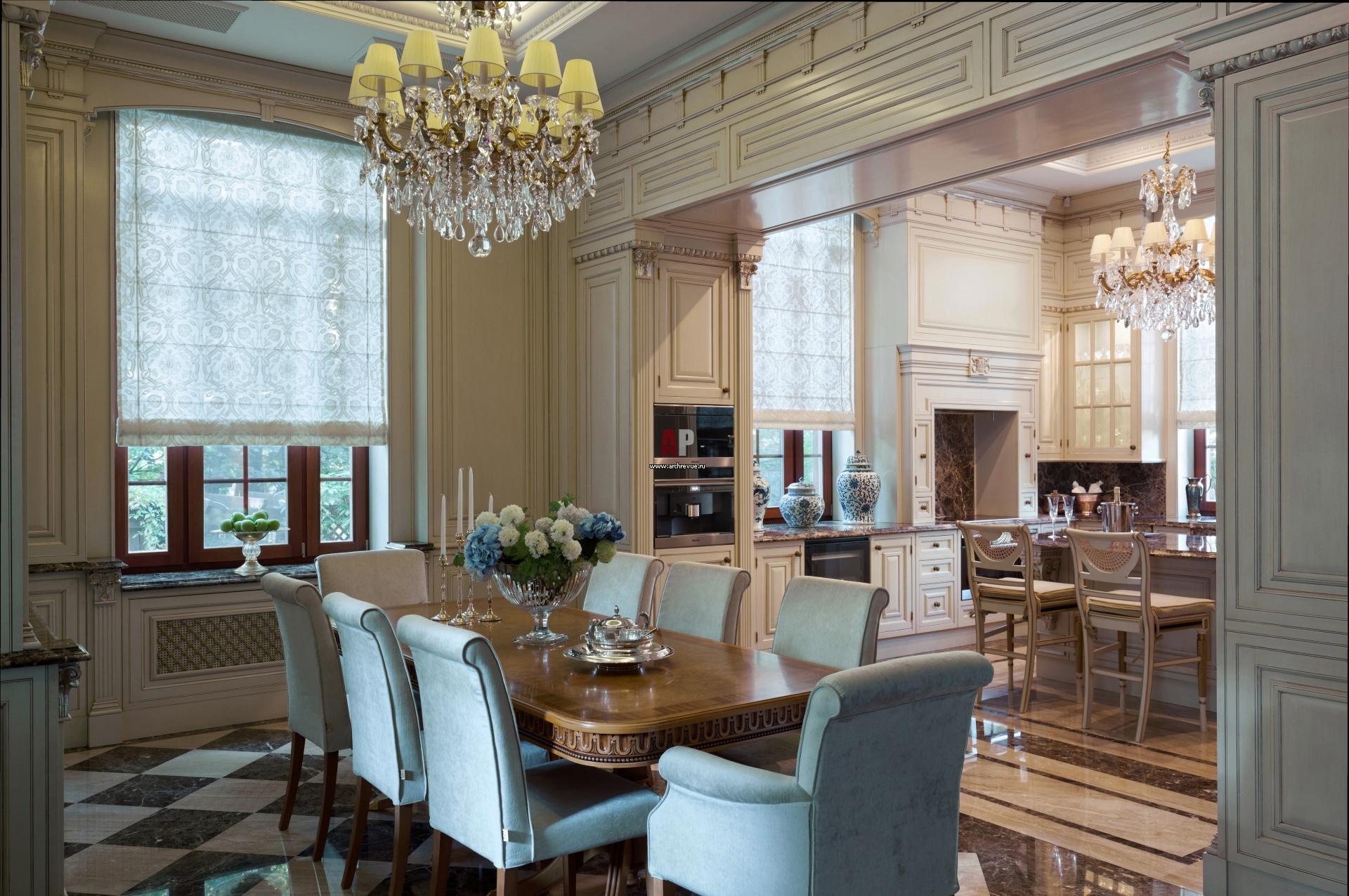 Столовая объединена с кухней широким порталом. Вертикальные колонны техники встроены в конструктивные перекрытия. Обеденный стол, Francesco Molon. Барные стулья, Clive Christian.
