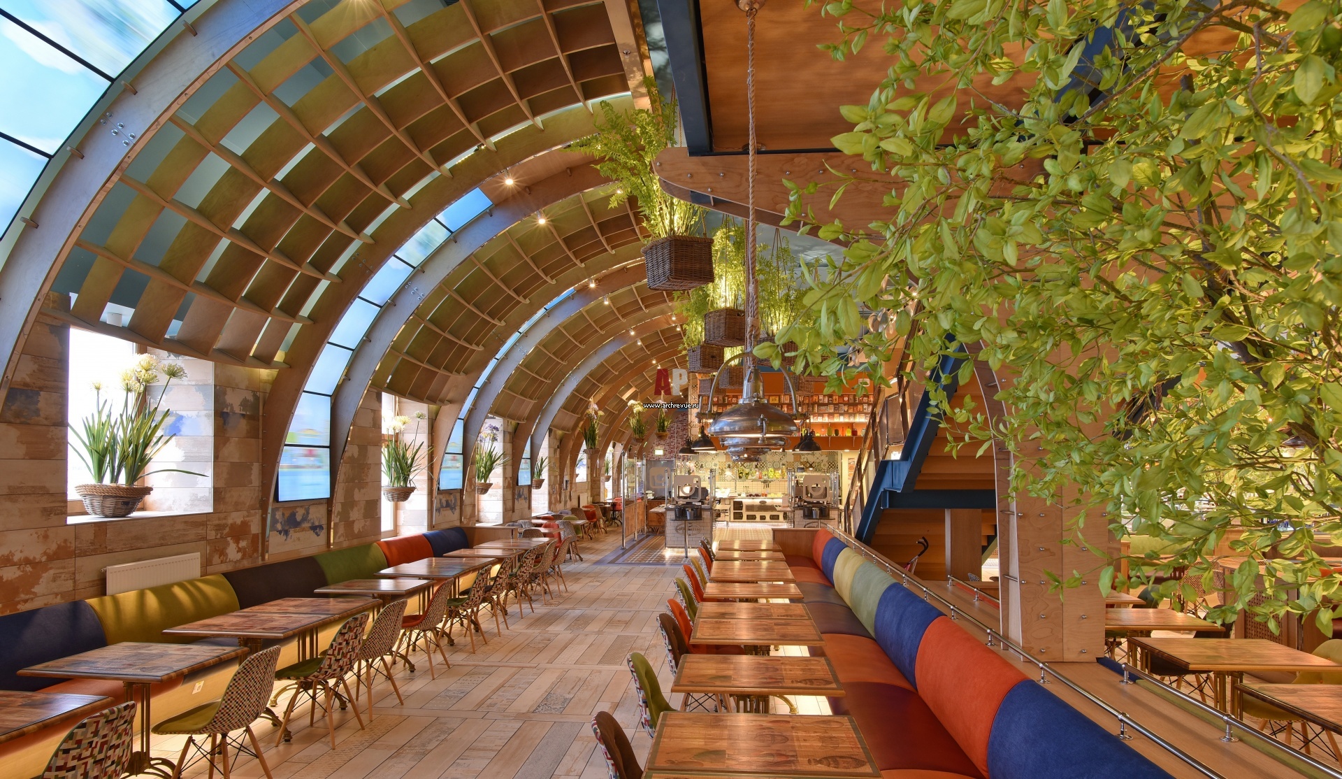 Особенность зада первого этажа площадью 493 кв. м – большая высота и радиусные стены, зашитые фанерой, имитирующей корпус дирижабля. Пол выложен плиткой, имитирующей старую амбарную доску.