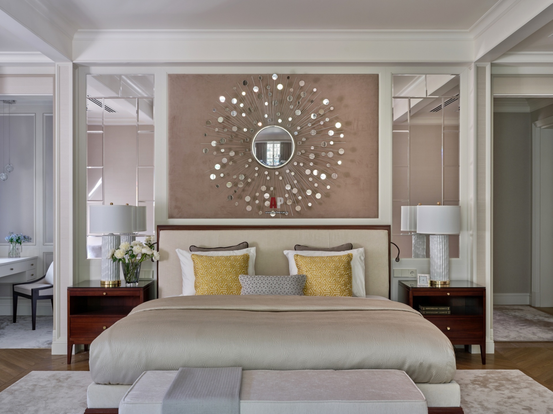 Хозяйская спальня. За кроватью расположена гардеробная с туалетным столиком. Стена у изголовья кровати декорирована шелковыми обоями и симметричными зеркалами с фацетом. На полу дубовый паркет в раскладке «французская елка».