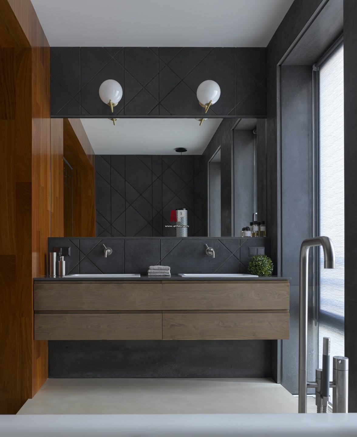 Ванная комната примыкает к спальне хозяев. Она задумана как полноценная комната с окнами в пол, продолжение спальни, продолжение отдыха. Раковина, Alape. На стенах – базальт, распиленный по эскизам.