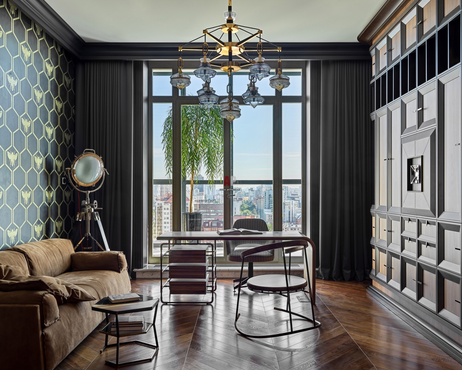 Кабинет с элементами ар-деко. На стенах – декоративная штукатурка с трафаретом. Письменный стол, журнальный столик и кресло-качалка привезены из Сингапура. Диван, Baxter. Люстру купили в Турции.
