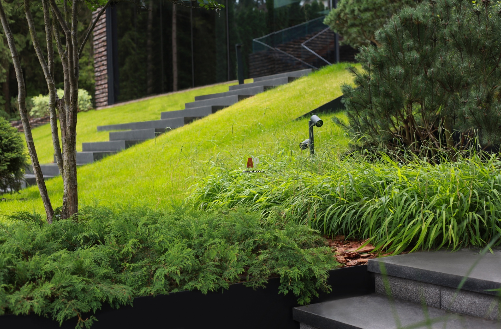 Современный сад с каскадными водопадами и арт-объектами. Фрагмент оформления участка.