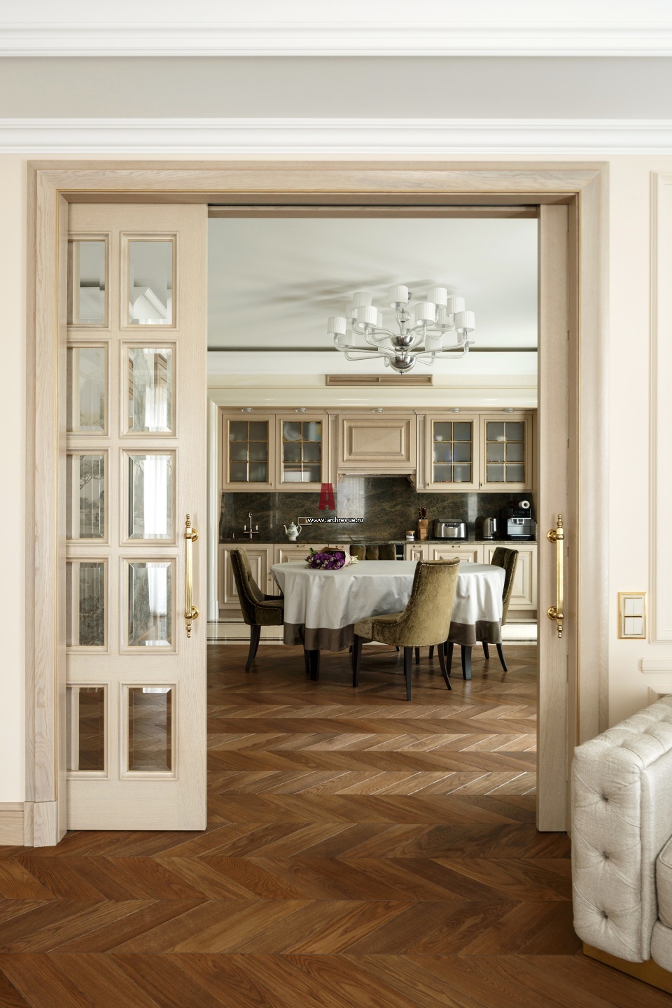Вид из гостиной на столовую. Заказные изделия – двери, встроенные шкафы, стеллаж ТВ, кухня – объединяют элементы интерьера в цельную композицию.