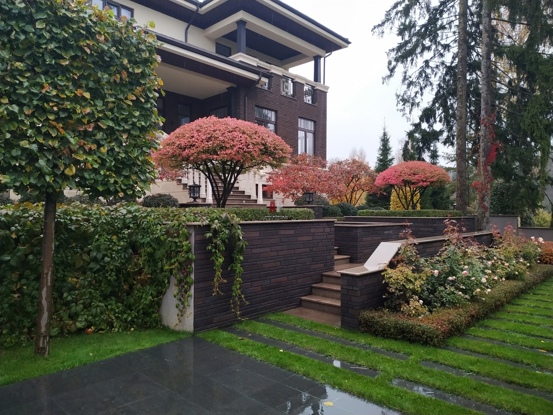 Патио возле главного входа в дом. Симметрию и парадность лестничных спусков поддерживают «зонты» из бересклетов. Их стволы утопают в вечнозеленой «подушке». Строгие линии бордюров из спиреи подчеркивают парадную архитектуру дома. Небрежно увивающий стены виноград делает этот уголок еще более уютным.