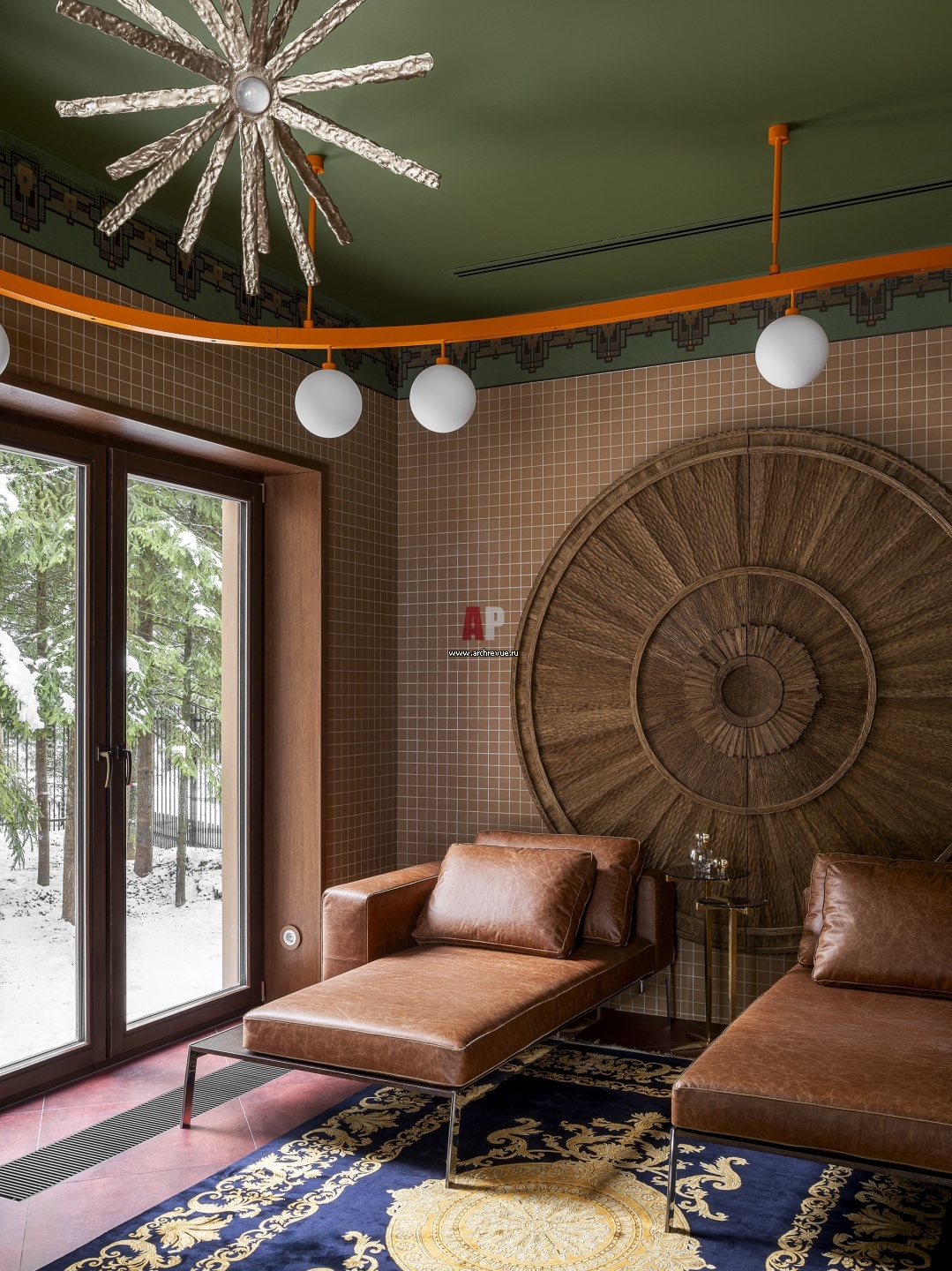 Зона отдыха при СПА-комплексе. Мягкие кушетки, на заказ. Люстра-звезда, Vetvi Store, модель Star. Панно на стенах – художник Алексей Березняк.