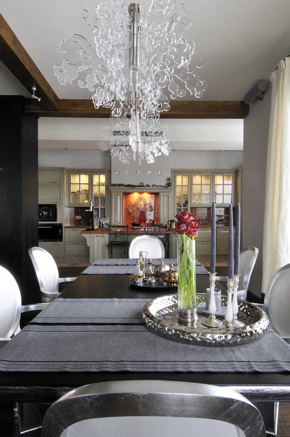 Расположенная в едином пространстве зона столовой оформлена авторской витриной, выполненной в «Мастерская Вениамина Скальника», и украшена акцентной люстрой, поставщик «Галерея дизайна и интерьера Neuhaus»
