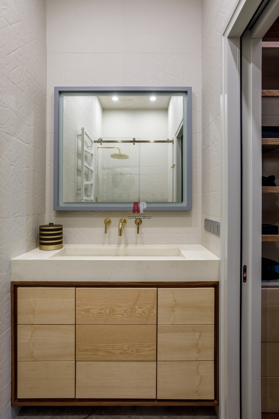 Хозяйский санузел получился небольшим. Тумба под раковину, на заказ. Раковина выполнена из белого бетона. Смесители, Nicolazzi.