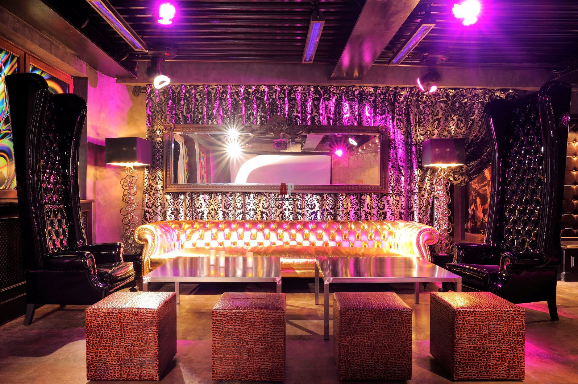 Зона ресторана расположена на подиуме. Диван из золотой кожи усыпан стразами. Кресла с высокими спинками сияют глянцем. Штора с серебряным рисунком контрастирует с бетонными стенами. Все выполнено по эскизам дизайнеров, изготовление Beni.