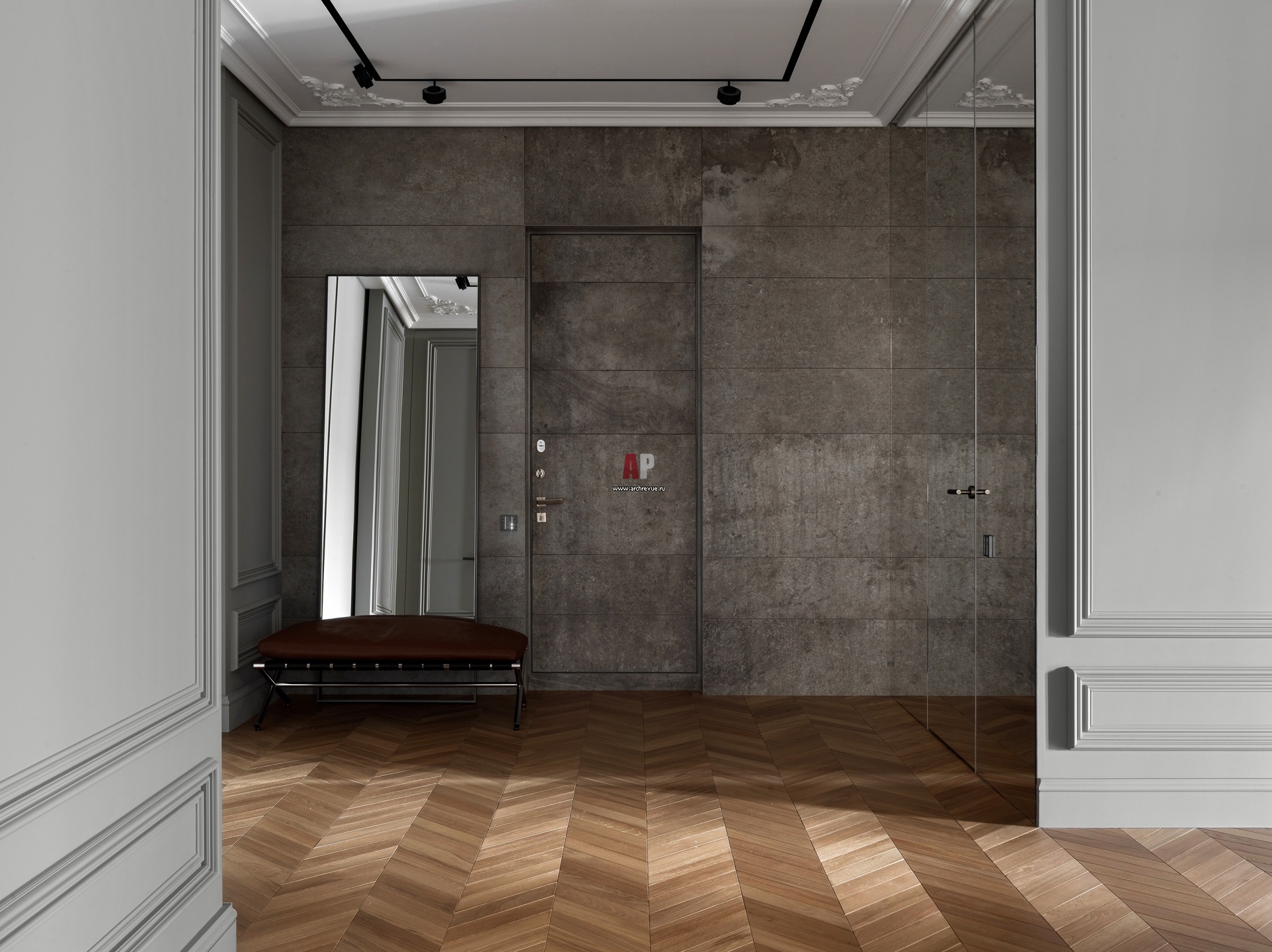Прихожая. Входная двери и стены оформлены фактурой камня. Банкетка, Minotti.