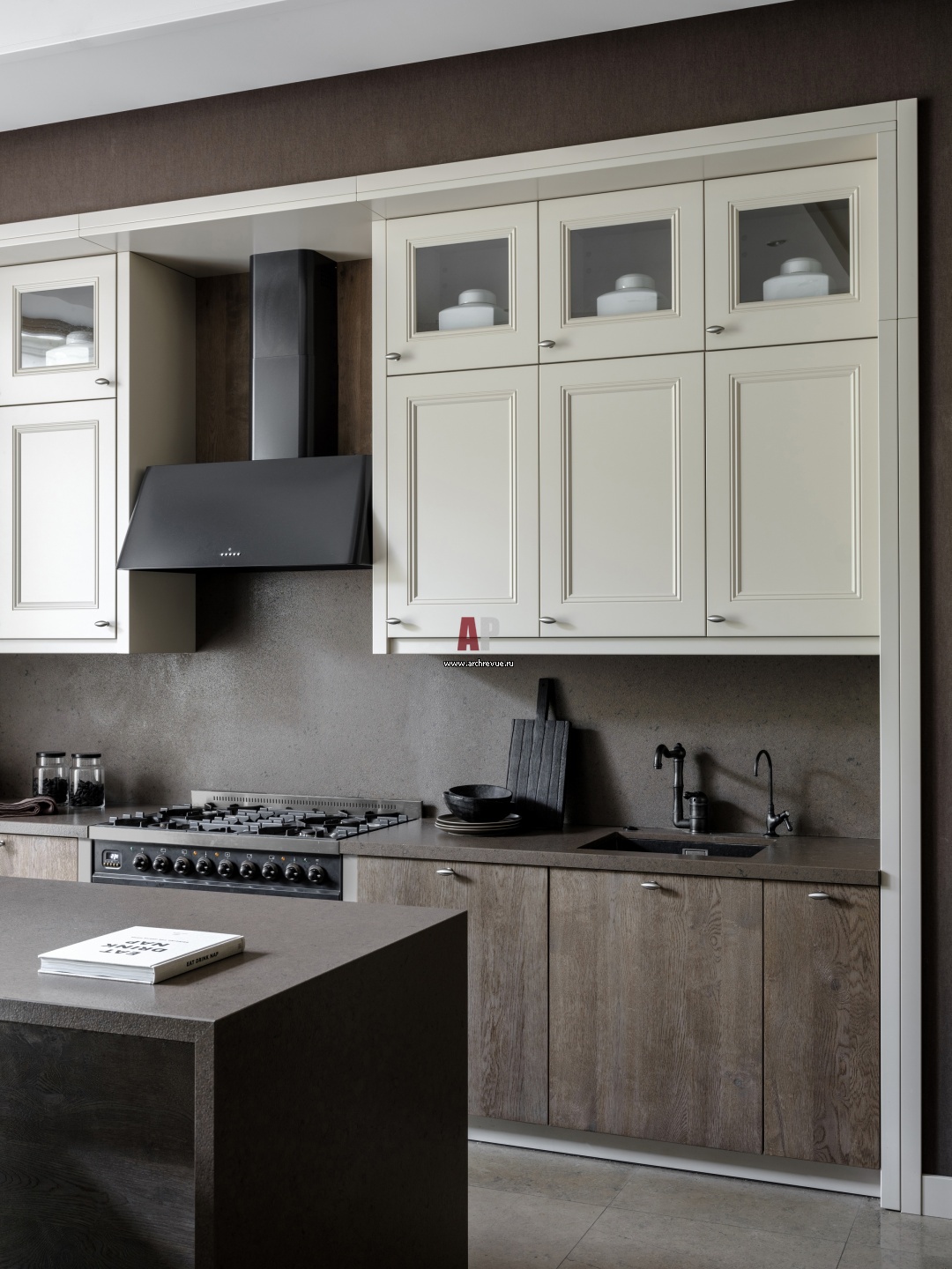 Кухня, Eggersmann. На фасадах скомбинированы лаконичные деревянные (нижние шкафы) и светлые классические (верхние шкафы) дверцы.