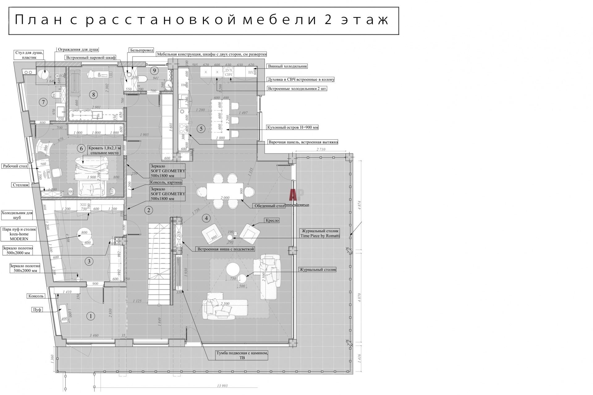 План второго этажа трехэтажного дома. Общая площадь – 600 кв. м.