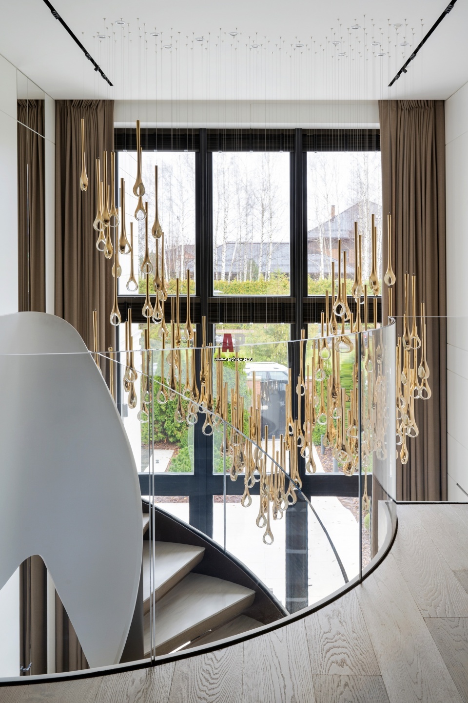 Холл второго этажа с лестницей, панорамным остеклением и видом на сад.