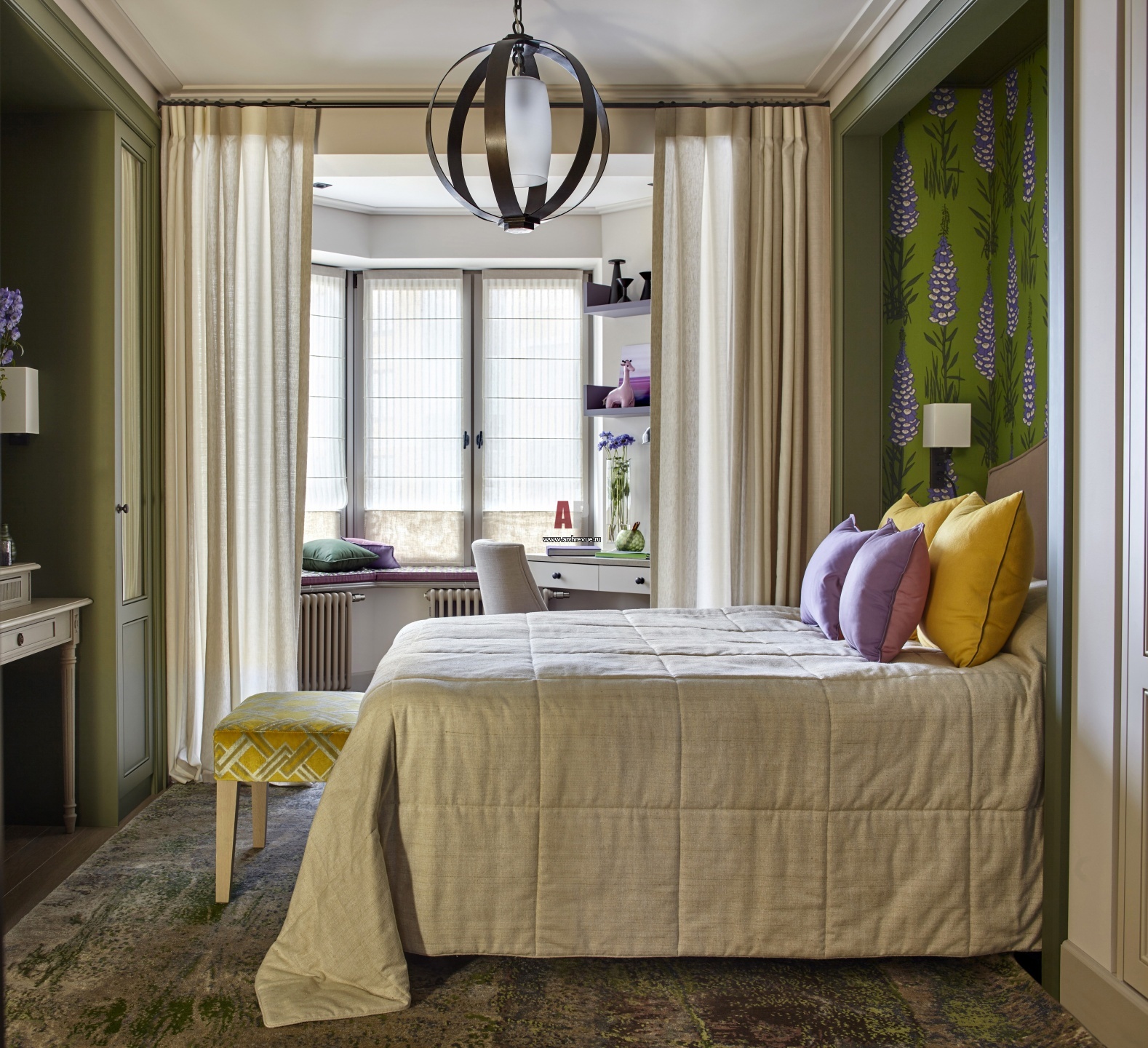 Комната девочки, июль. Кровать Vispring. Туалетный столик, Homes in Heaven. Настенные светильники, Stephane Davidts. Люстра, E. F. Chapman. Банкетка Marie's Corner перетянута в ткань Gaston y Daniela. Зеленые обои с колокольчиками, Osborne&Little.
