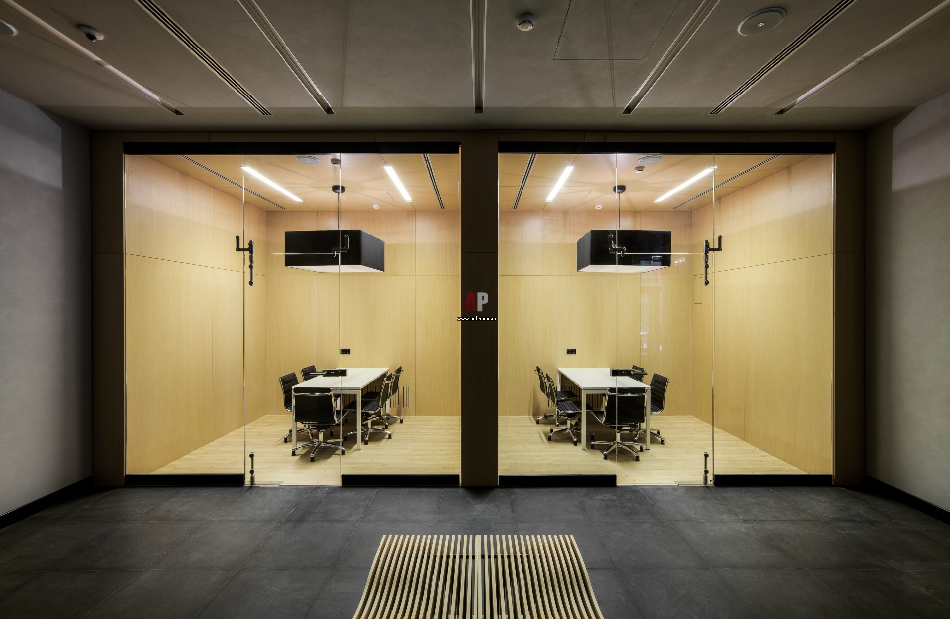 Дизайн симметричных переговорных в приемной первого этажа исполнен на контрасте темно-серого керамогранита пола, черного обрамления стеклянных дверей и панелей из светлого дерева.
