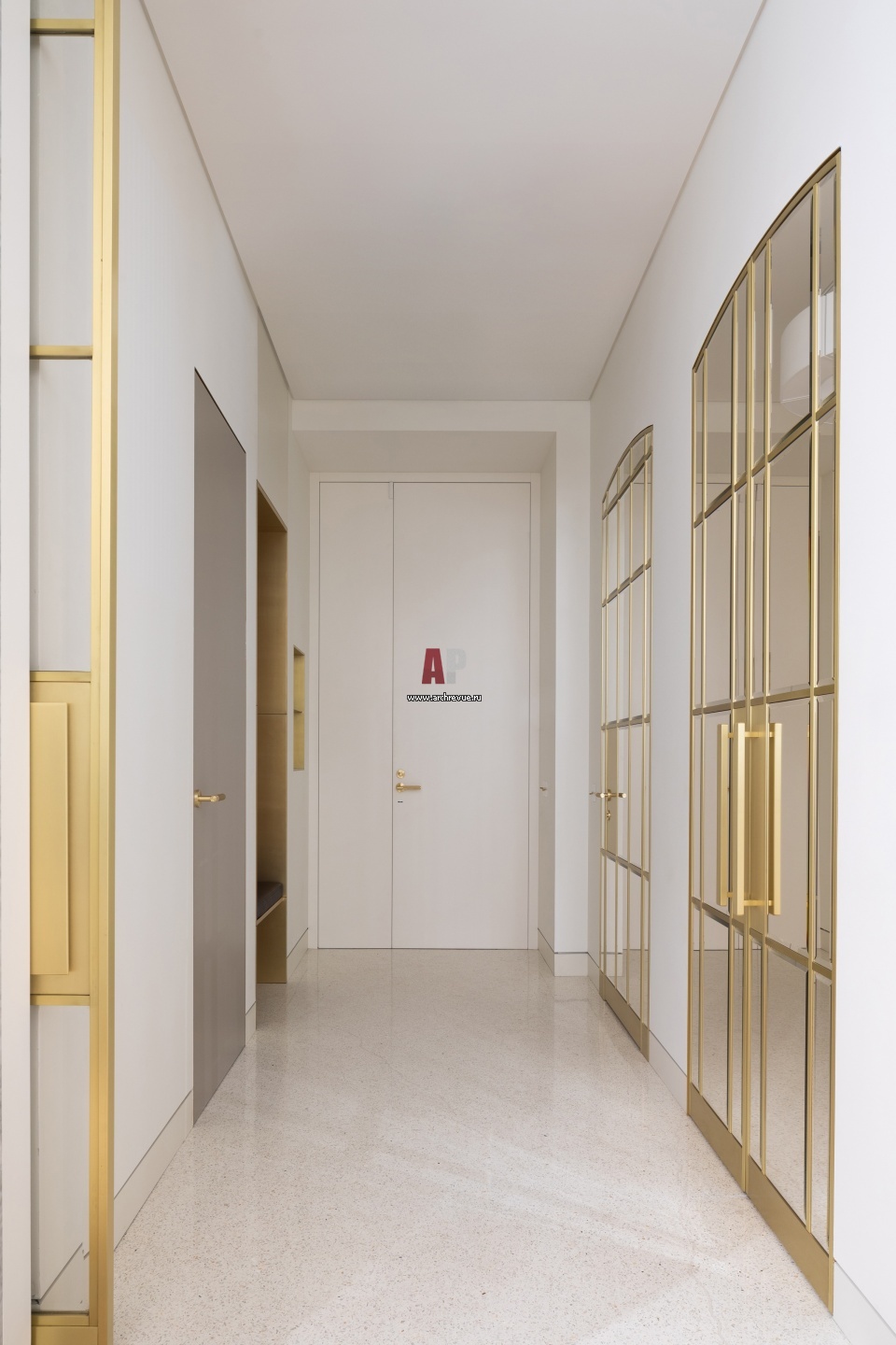 Входная группа. Стилеобразующий элементы интерьера – стеклянные и зеркальные откатные и распашные витражные двери в латунных рамах.
