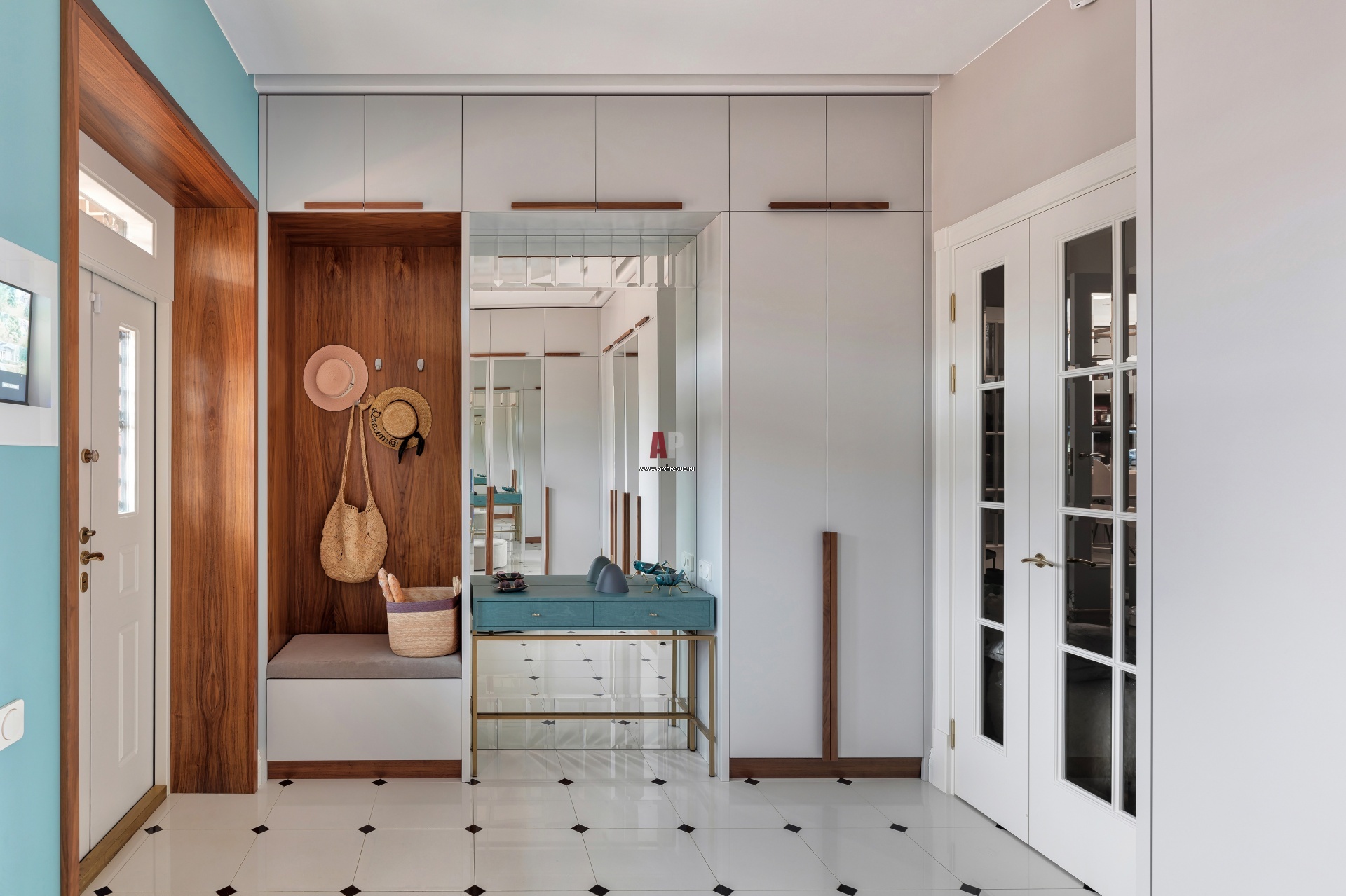 Одна стена в прихожей выкрашена в акцентный небесно-голубой цвет. На полу – белый керамогранит с контрастными вставками. Консоль из голубого дерева, Rooma Design & Furniture. Встроенная мебель, на заказ.