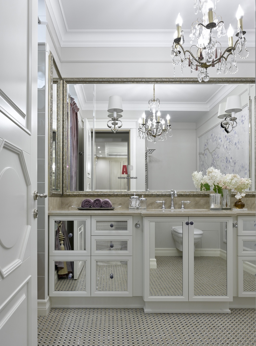 Интерьер ванной комнаты в стиле неоклассика. Умывальник с зеркальными вставками сделан на заказ, Mrs Ruby. Столешница из мрамора. Сантехника, Villeroy & Boch. Светильники, Visual Comfort & Co.