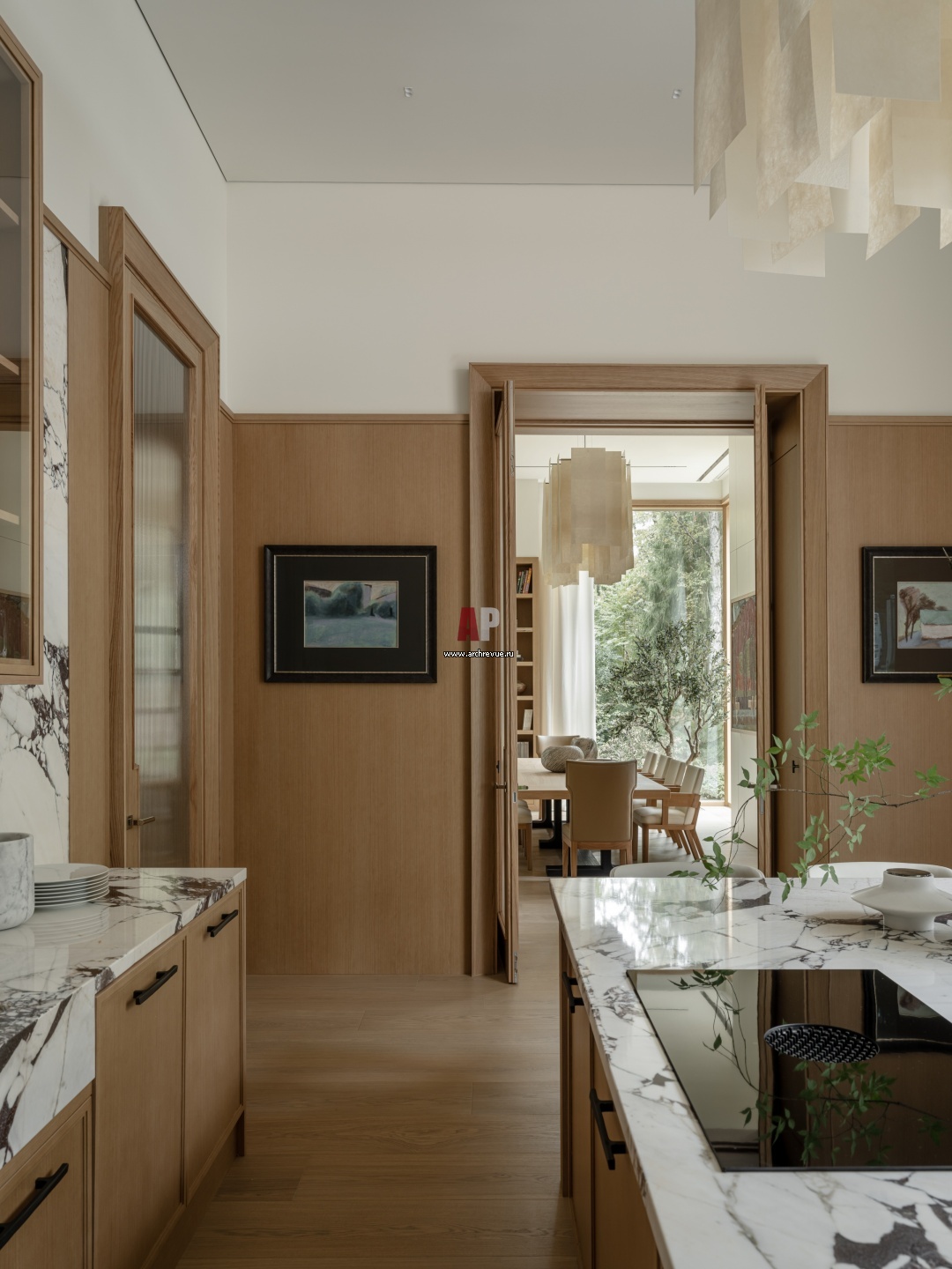 Современный семейный дом с теплой атмосферой. Оформление кухни строится на контрасте теплого натурального дерева и черно-белого камня.