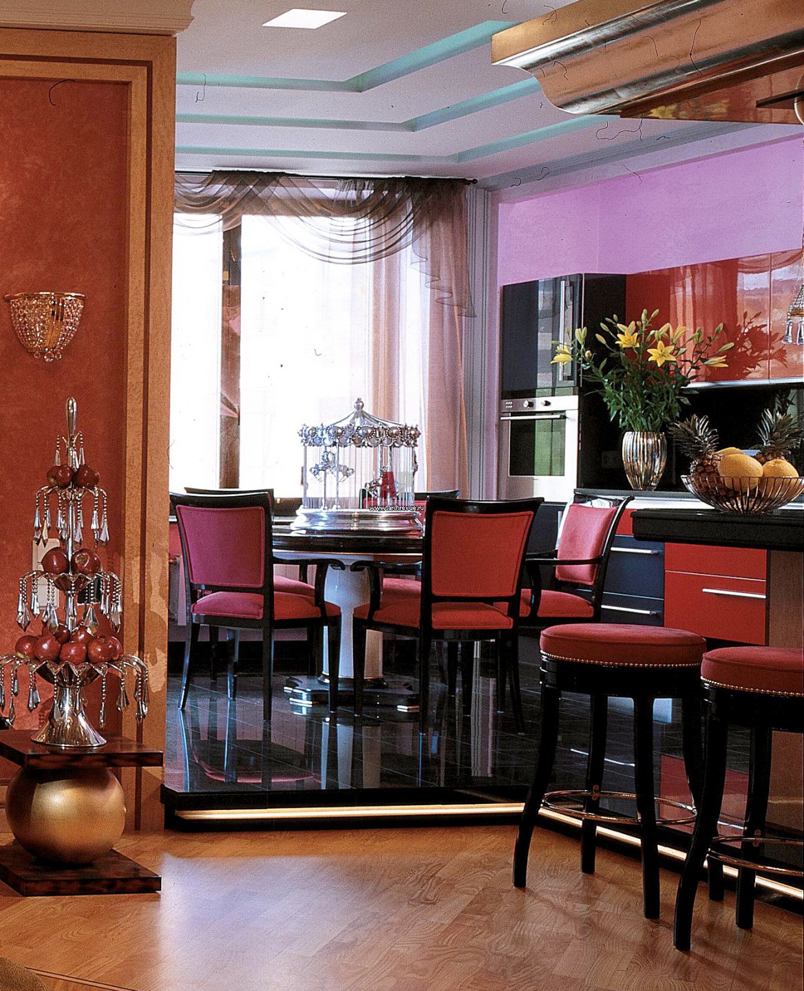 Зона кухни-столовой в интерьере квартиры в стиле ар-деко. Столовая группа и «мокрая зона» вынесены на подиум из черного мрамора.