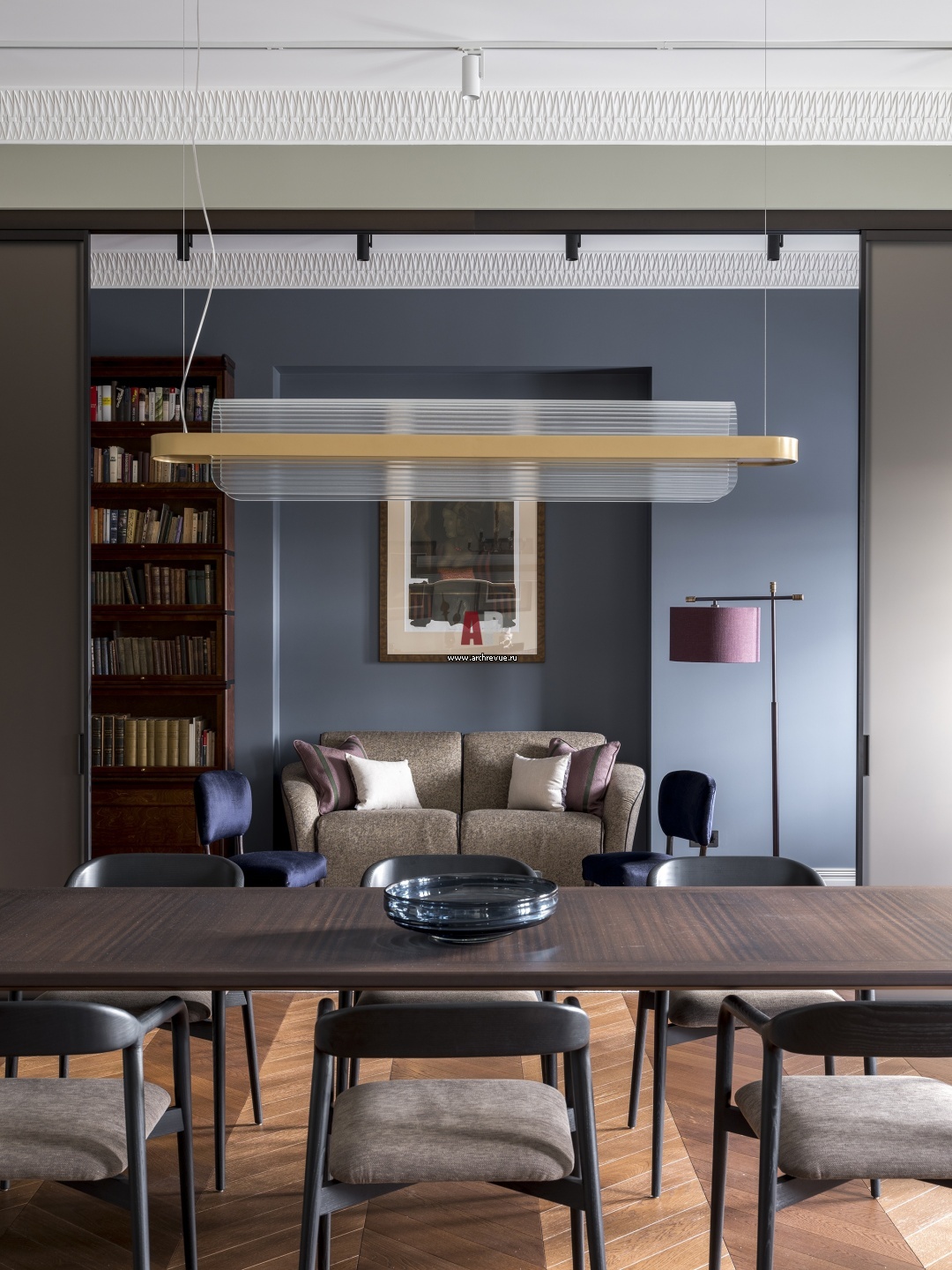 Кабинет может трансформироваться. От гостиной от отделен системой высоких раздвижных полотен из бронзового стекла. Она, с одной стороны, эффективно зонирует пространство, с другой – за счет бликов на зеркале делает его воздушным. Светильник над столом, Kundalini.