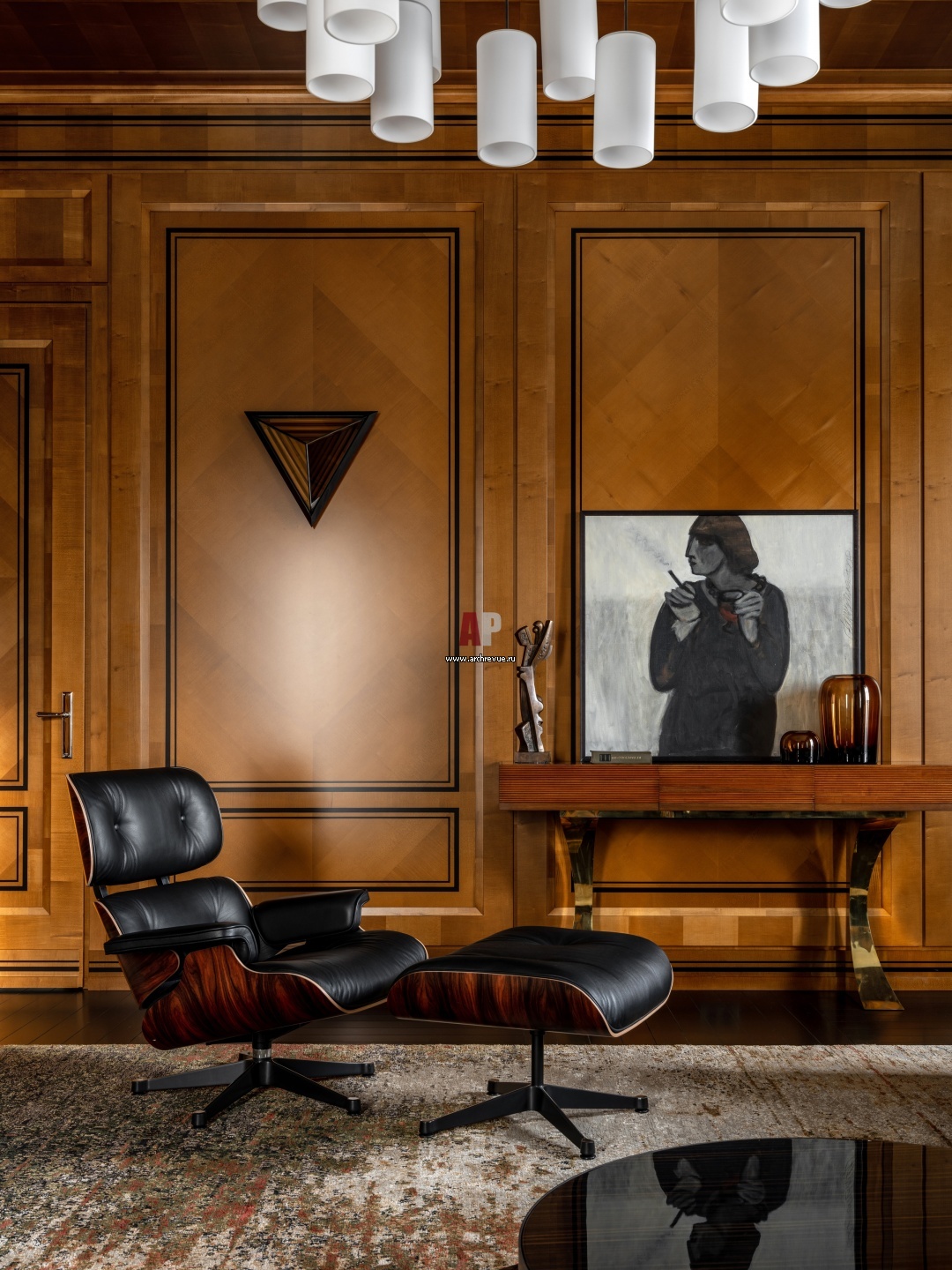 Музыкальная гостиная. Стеновые панели из шпона клена. Кресло Vitra, модель Eames Lounge. На консоли – скульптура «Росток» Андрея Антонова. Картина Инны Бажутиной «Люся». Люстра, Santa & Cole. Треугольные бра, Roll & Hill.