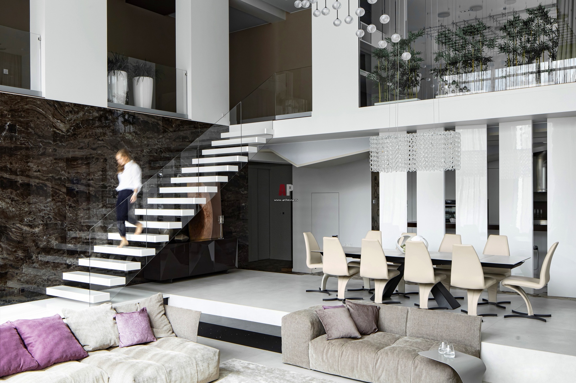 Конструкция консольной лестницы была спроектирована на раннем этапе строительства дома. Стена отделана крупноформатным керамогранитом (2400х1200 и толщиной 5 мм), который пришлось «надевать» на уже собранные ступени. Заранее заготовленные отверстия должны были совпасть до миллиметра.