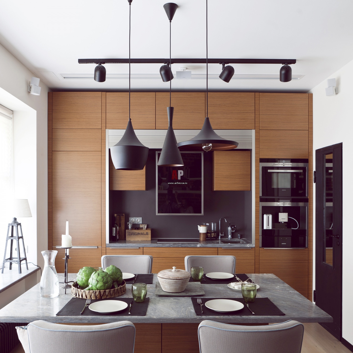 Интерьер столовой в современной квартире-студии. Обеденная группа акцентирована светильниками из черного металла работы дизайнера Тома Диксона. Кухонный гарнитур из тика.