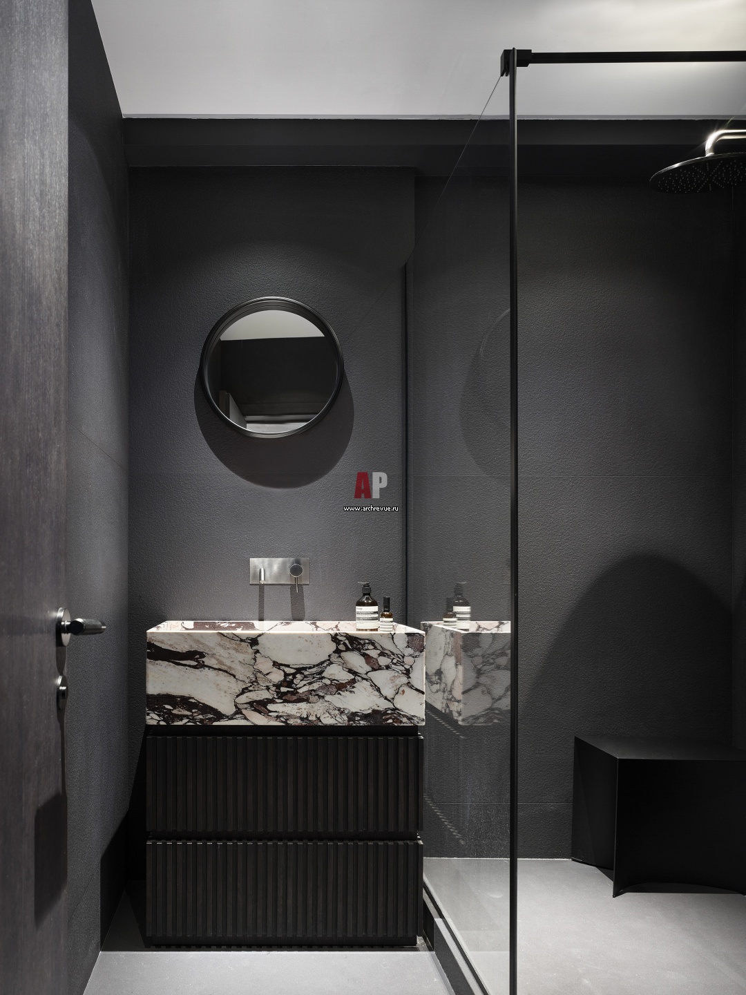 Санузел. Раковина сделана из того же мрамора, что использовался для откосов, кухонного острова и пола в прихожей. Тумба под раковину из темного тонированного дуба, на заказ.