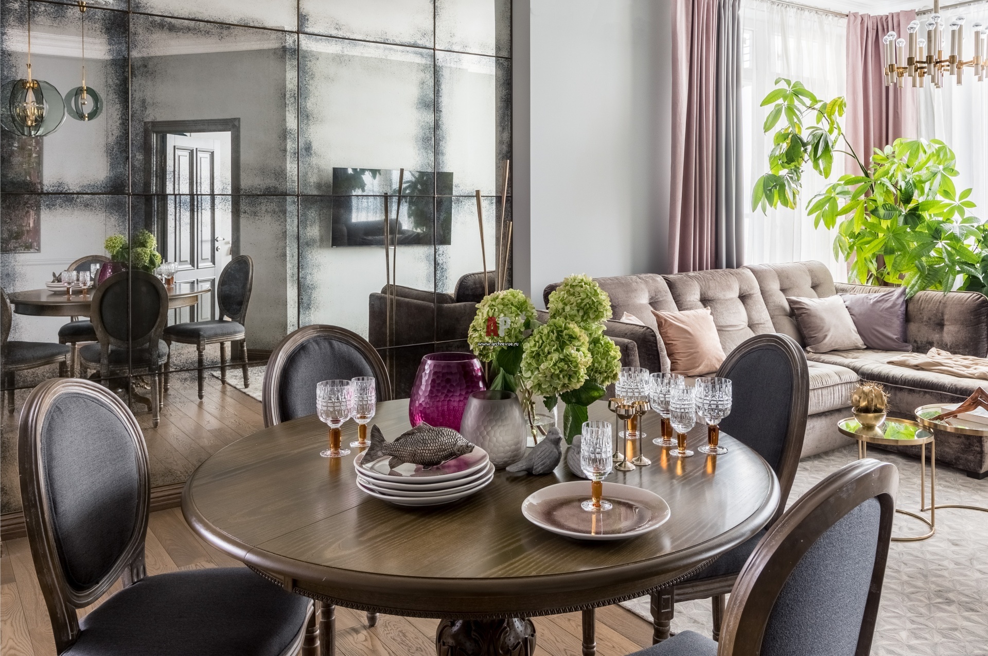 Интерьер гостиной 3-х комнатной квартиры с декоративной зеркальной стеной.