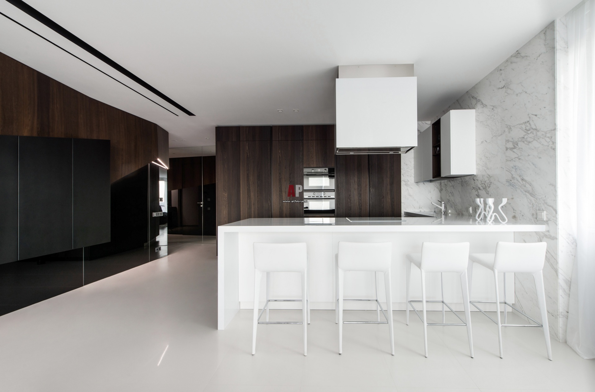 Зона кухни. Кухонная мебель, Cesar. Барные стулья, Bonaldo. Кухонный фартук отделан мрамором Volakas. Из соображений практичности столешница рабочих поверхностей сделана из белого кориана.