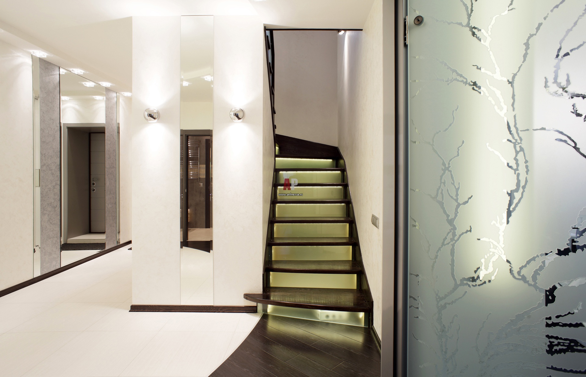 На фото – лестничный холл в таунхаусе. Лестница с забежными ступенями подсвечена светодиодами. Массивная половая доска из дуба уложена по диагонали, поставщик Villa di Parchetti.
