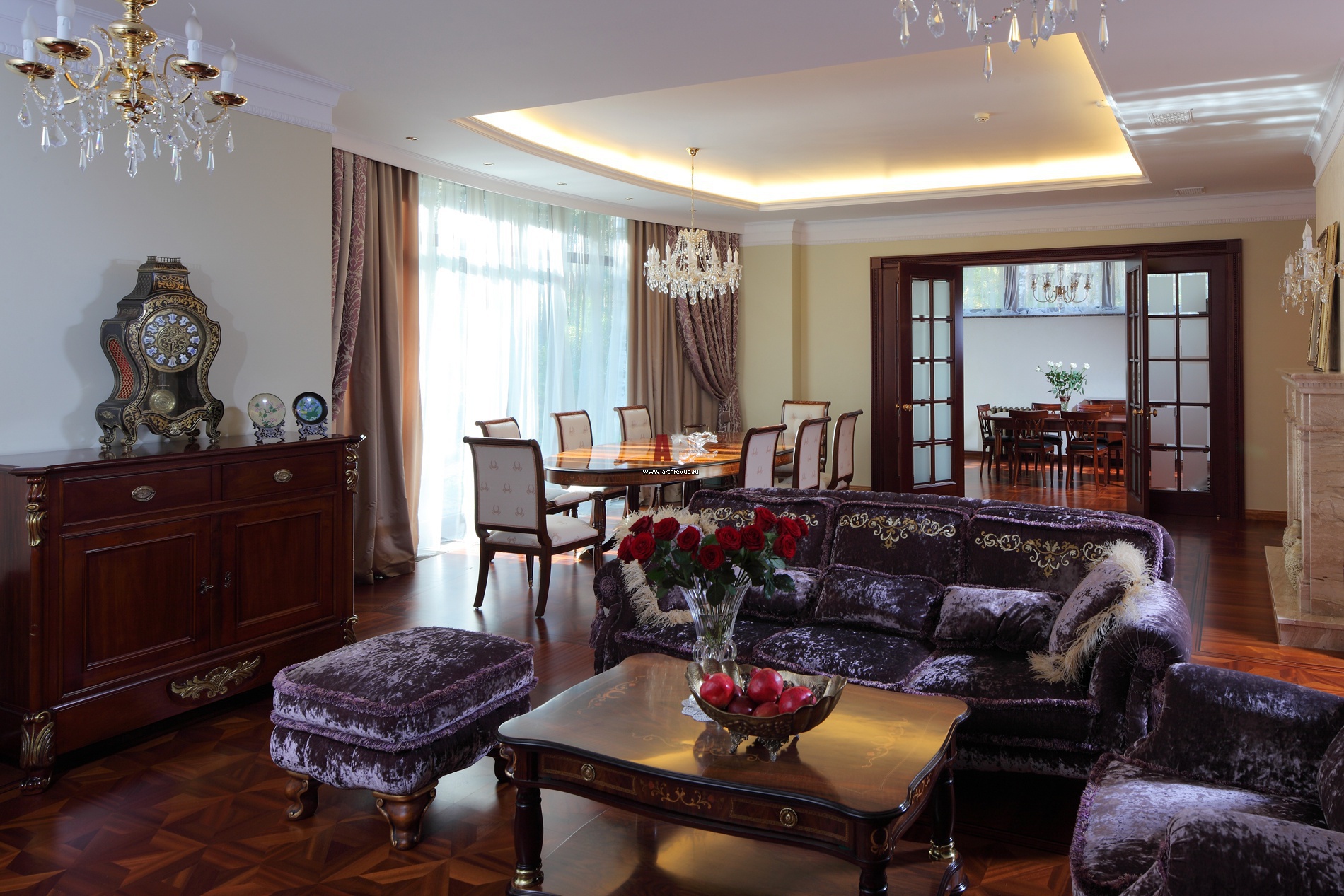 Гостиная находится за несущей конструкцией с росписью и фальш-камином. Она решена в традиционном классическом ключе.