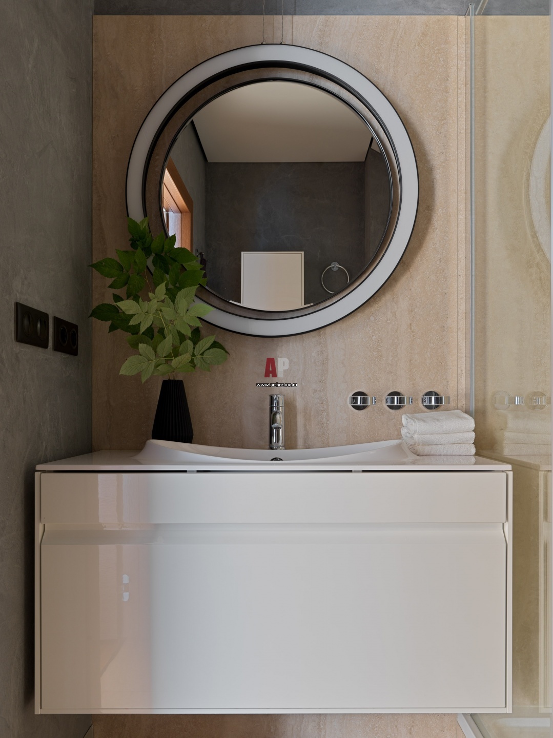 Каркасный дом в стиле барнхаус. Хозяйский санузел на втором этаже. В отделке – натуральный травертин.