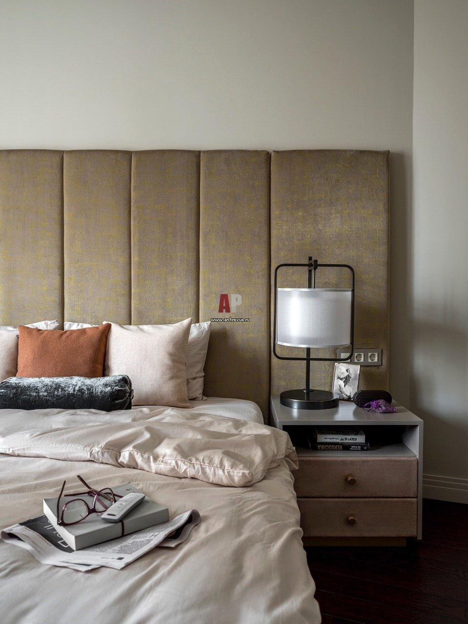 Хозяйская спальня. Изголовье кровати оформлено мягкими панелями с золотистой нитью. Каркас кровати и тумбы обтянуты мягкой кремовой замшей. Текстиль, Zara Home.
