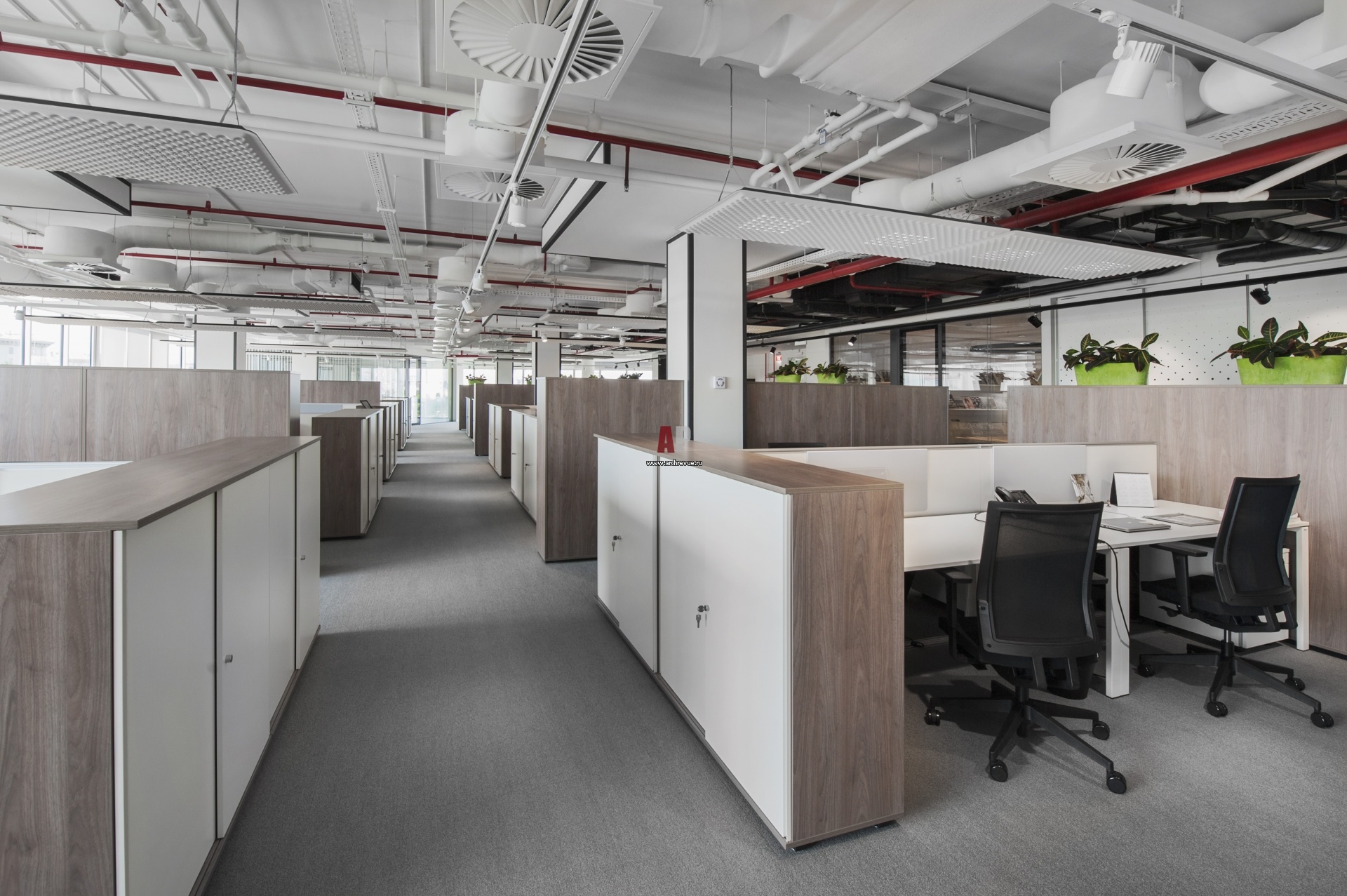В рабочей зоне оставлены открытые инженерные системы на потолке. Спринклерная система выкрашена в красный и выступает в качестве яркого арт-объекта в пространстве.