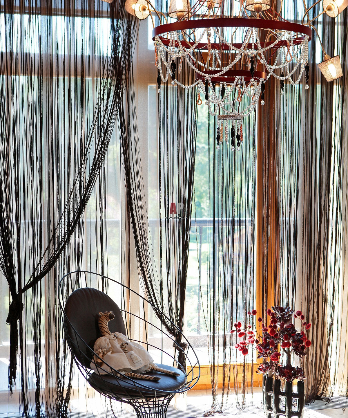 Фото детали интерьера спальни пентхауса в современном стиле. Шторы в виде длинной бахромы, текстильный дизайн «Анива Галери », перекликаются с дизайном «сетчатого» кресла Desiree.