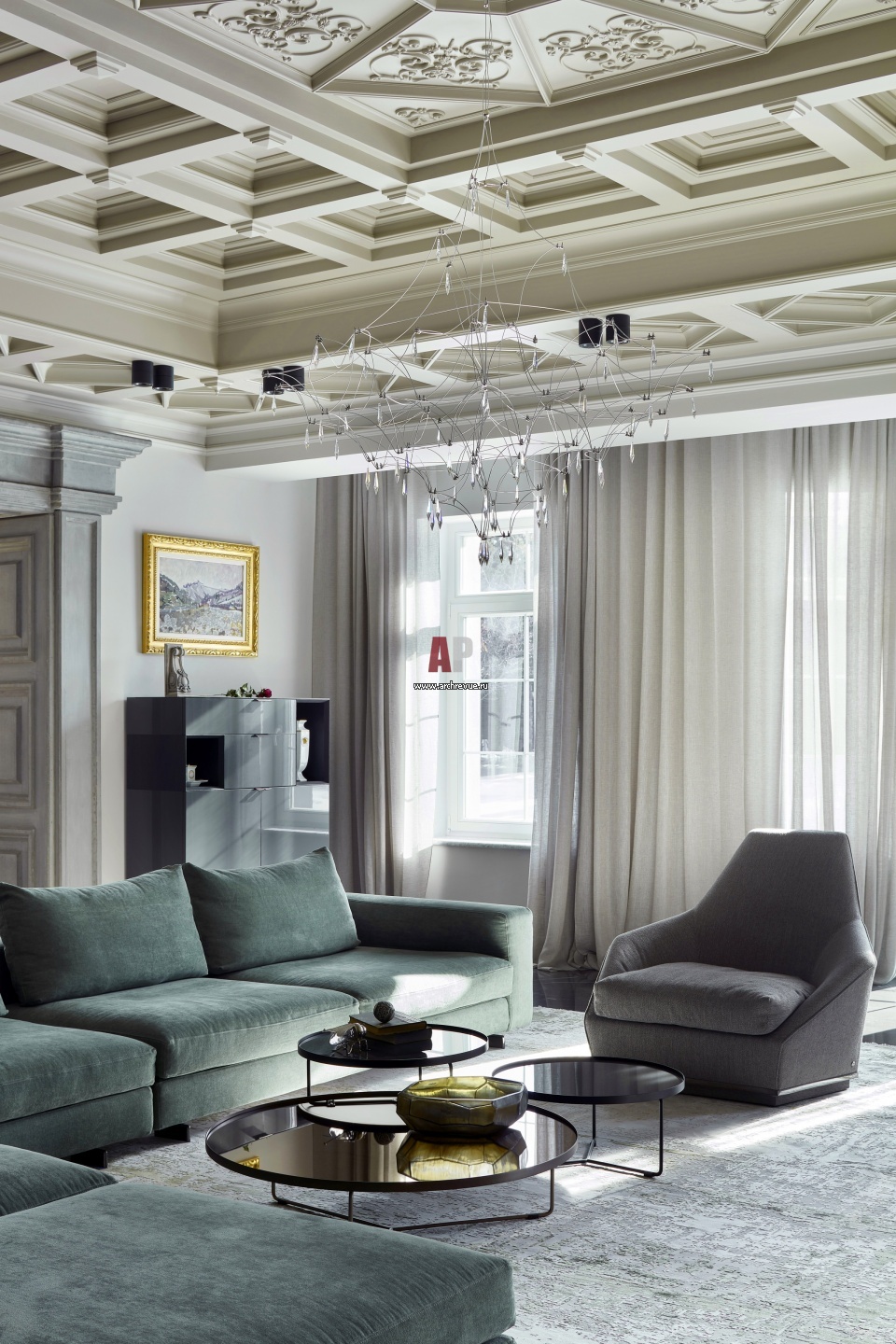 Эклектичный дом с элементами минимализма и рыцарского замка. Фишка первого этажа - Сочетание невесомых минималистичных светильников Quasar со сложными классическими потолками.