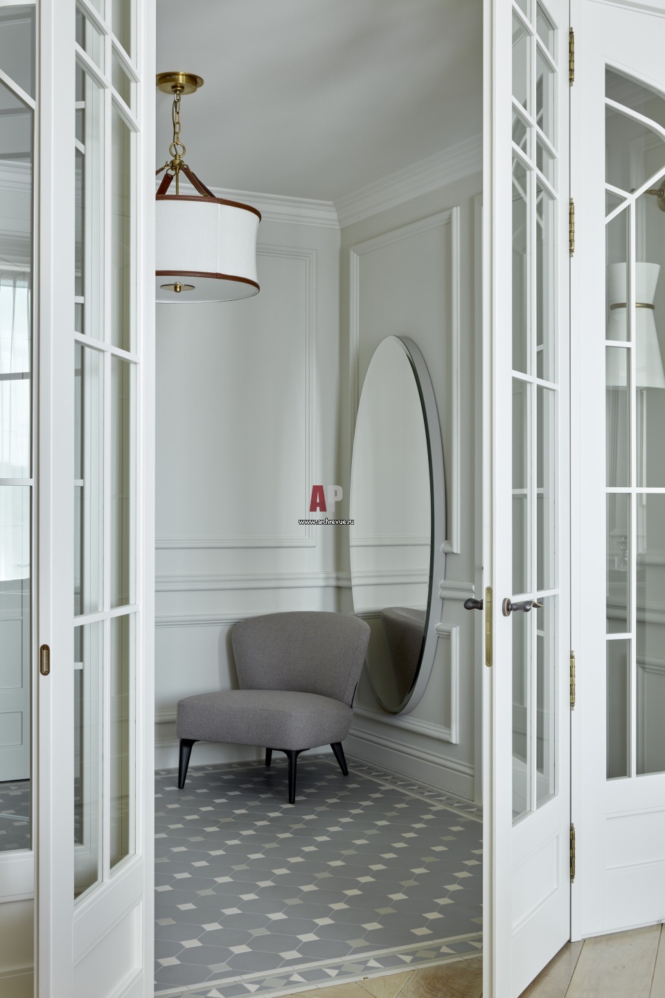 Интерьер входной зоны выполнен в традициях классики и белых тонах. На стенах краска, Argile. Кресло, Minotti, модель Aston Armchair. Зеркало Minotti. Светильник Visual Comfort & Co из серии Ralph Lauren.