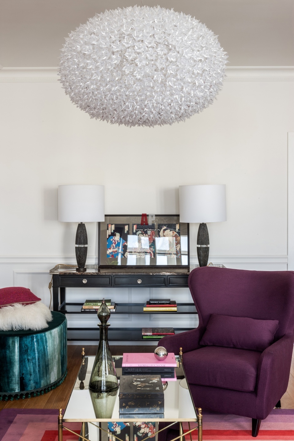 Стены в гостиной выкрашены в белый цвет и оформлены гипсовой раскладкой. На светлом фоне выгодно смотрится мебель и текстиль ярких цветов.