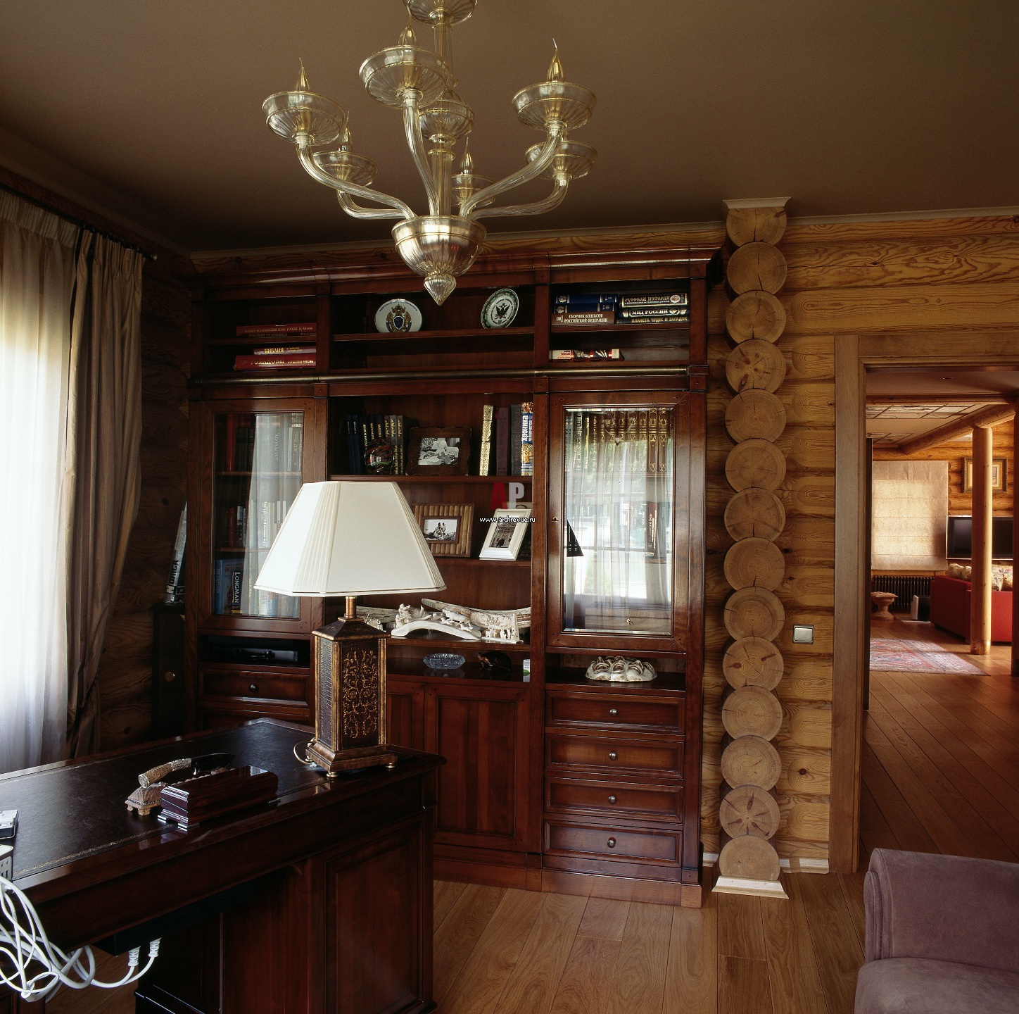 В кабинет подобрана итальянская мебель, которая выдержана в темных шоколадных тонах.