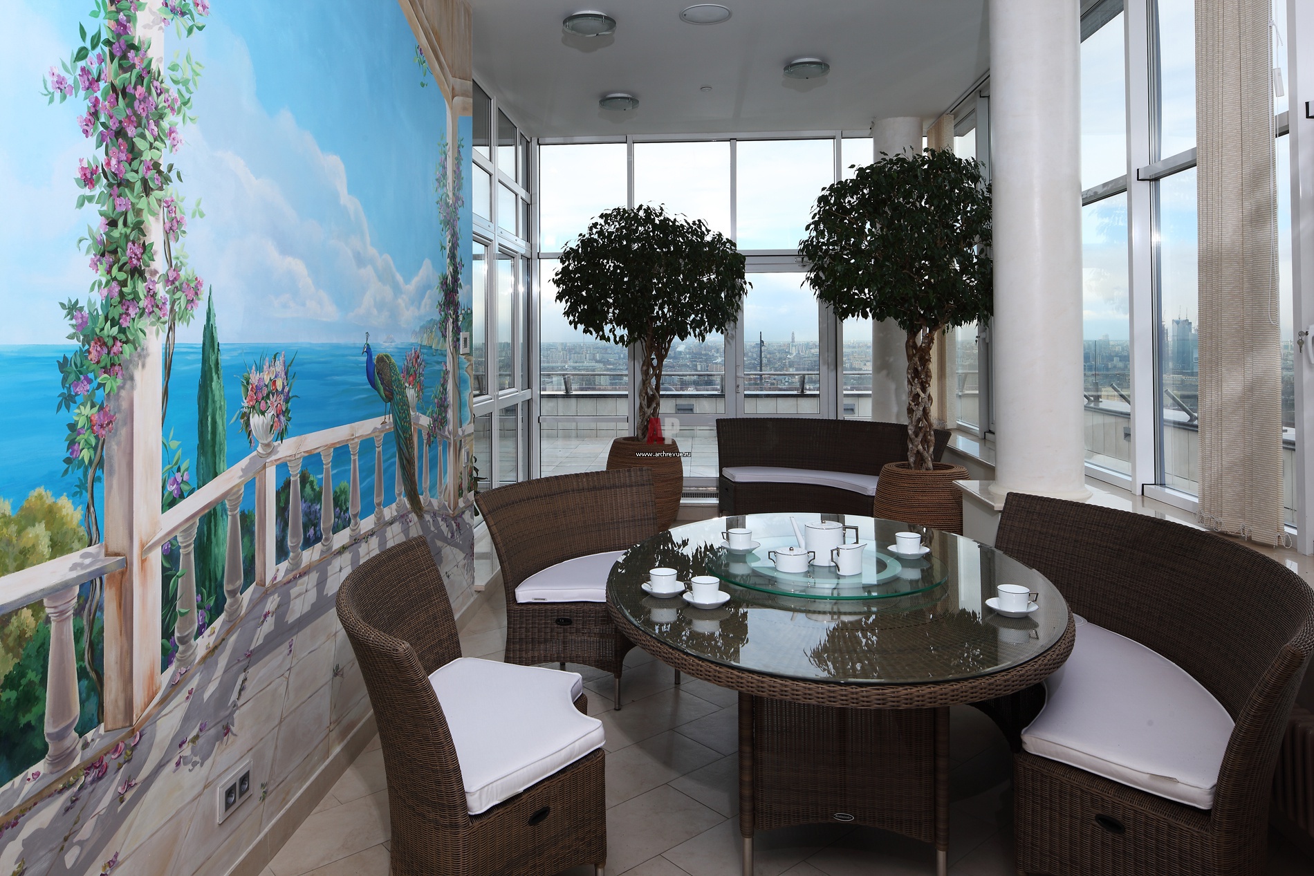 На просторной террасе с панорамным видом на город расположен зимний сад. Фреска с изображением летнего морского пейзажа оптически увеличивает пространство и настраивает на отдых.