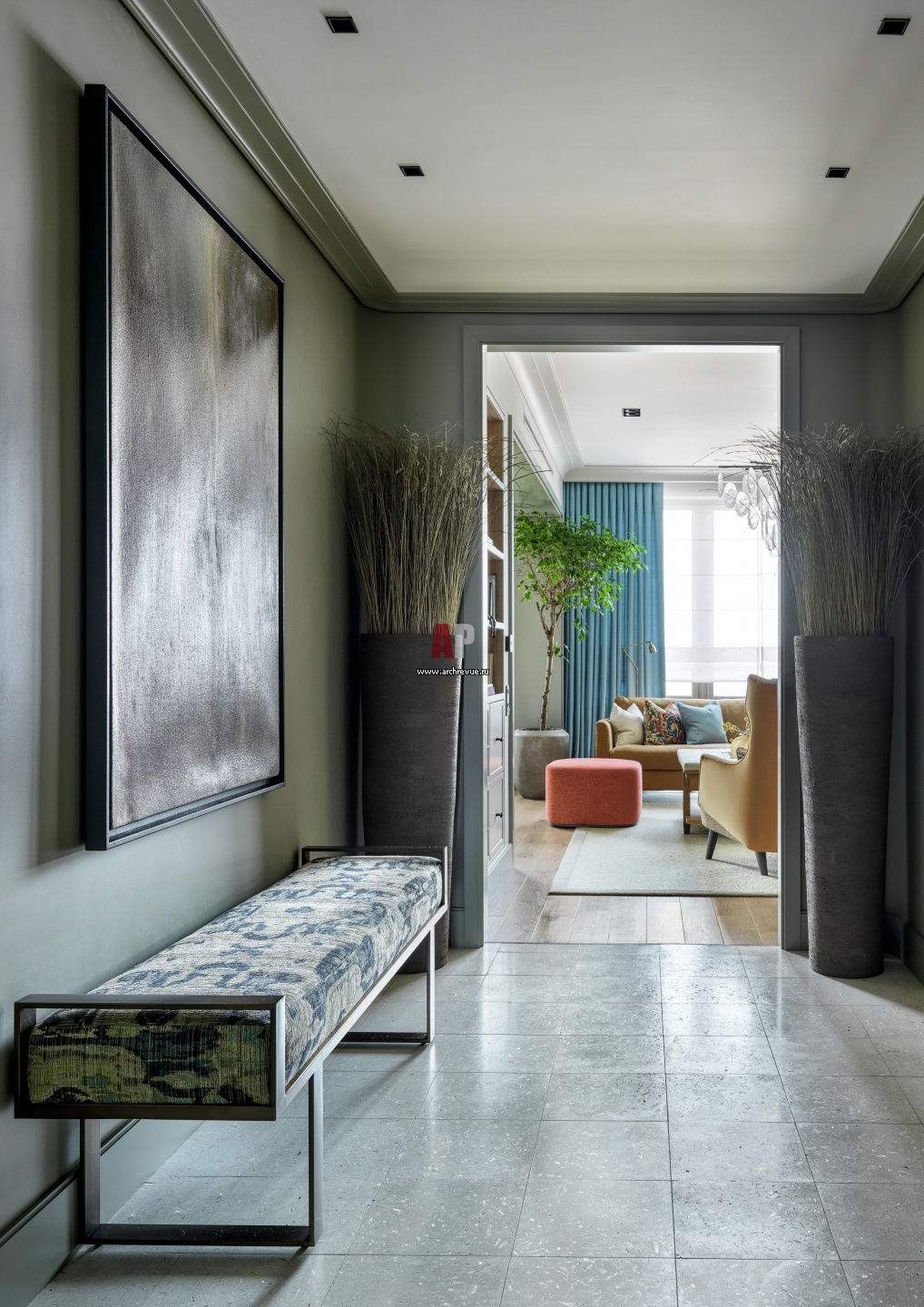 Входная зона выполнена в приглушенных тонах. Банкетка, Bernhardt в обивке тканью Robert Allen. Кашпо, Atelier Vierkant. Картина, художник Дмитрий Москаленко. На полу – французская цементная плитка с вкраплениями осколков мрамора, перламутра, латуни, стекла, terrazzo, Couleurs & Matieres.