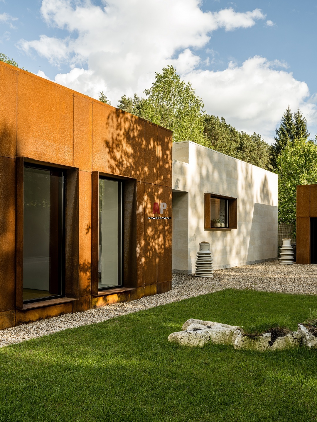 С фасада блоки-«кубики» отлично считываются благодаря плоской кровле разной высоты и индивидуальным акцентным материалам: кортеновская сталь, дагестанский песчаник и стекло.